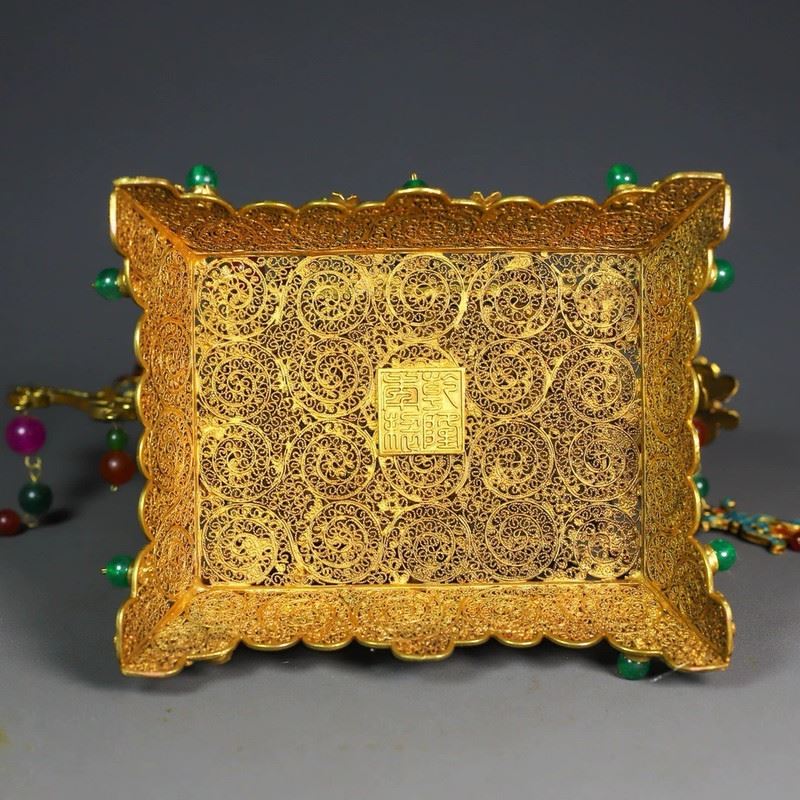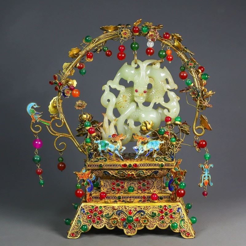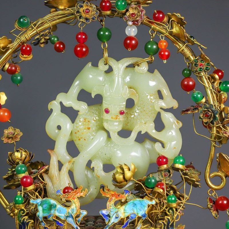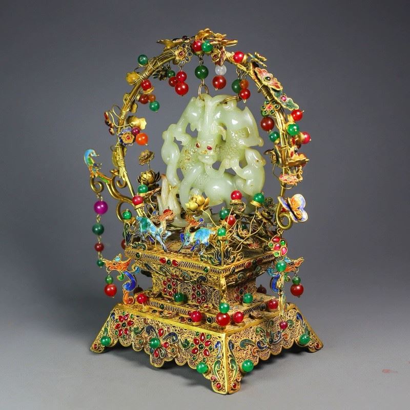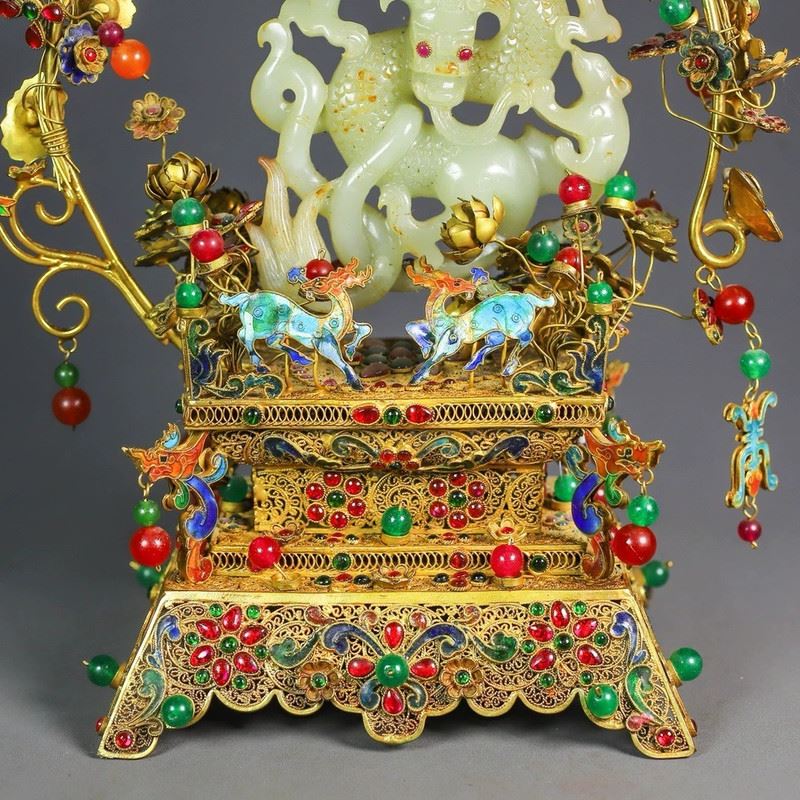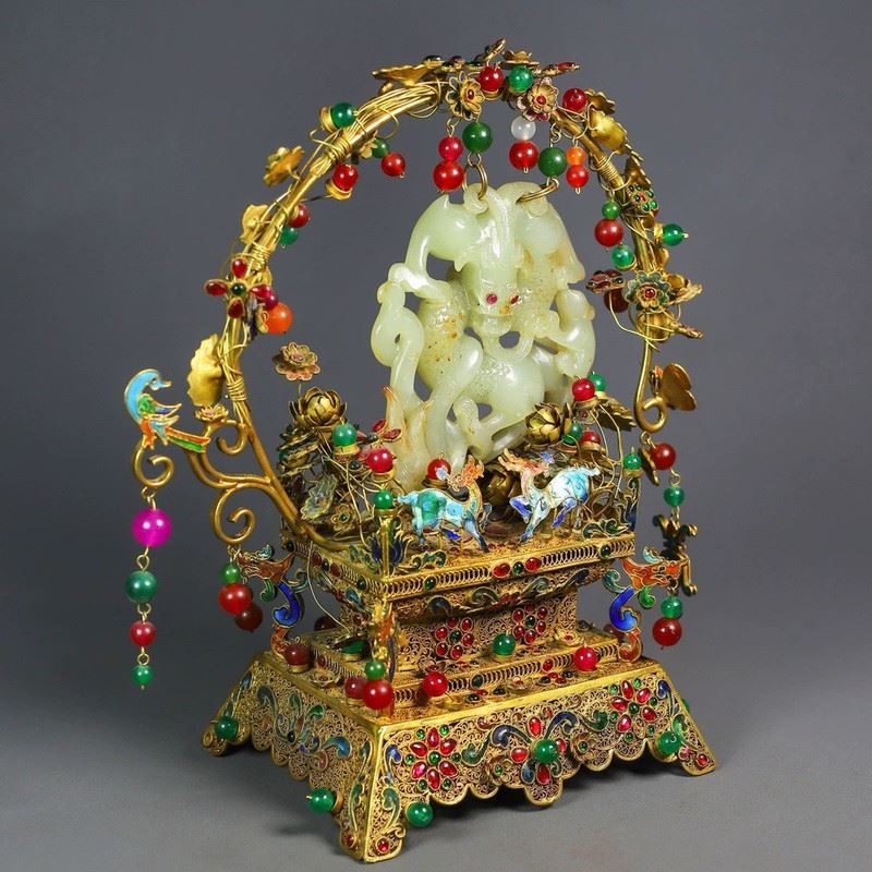 This exquisite piece is a Hetian jade gilded spiral auspicious dragon, masterfully combining the smoothness of Hetian jade with the splendor of gilding. The spiraling dragon symbolizes fortune and prosperity, and the blend of gold and jade reflects supreme craftsmanship and classical aesthetics. Surrounding it are vibrant gemstones, adding liveliness and charm to the piece. This artwork not only showcases traditional jade carving techniques but also embodies the artisan's meticulous attention to detail, making it a prized treasure for collectors and connoisseurs.