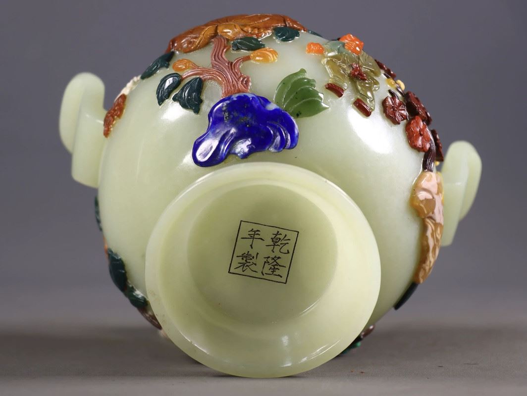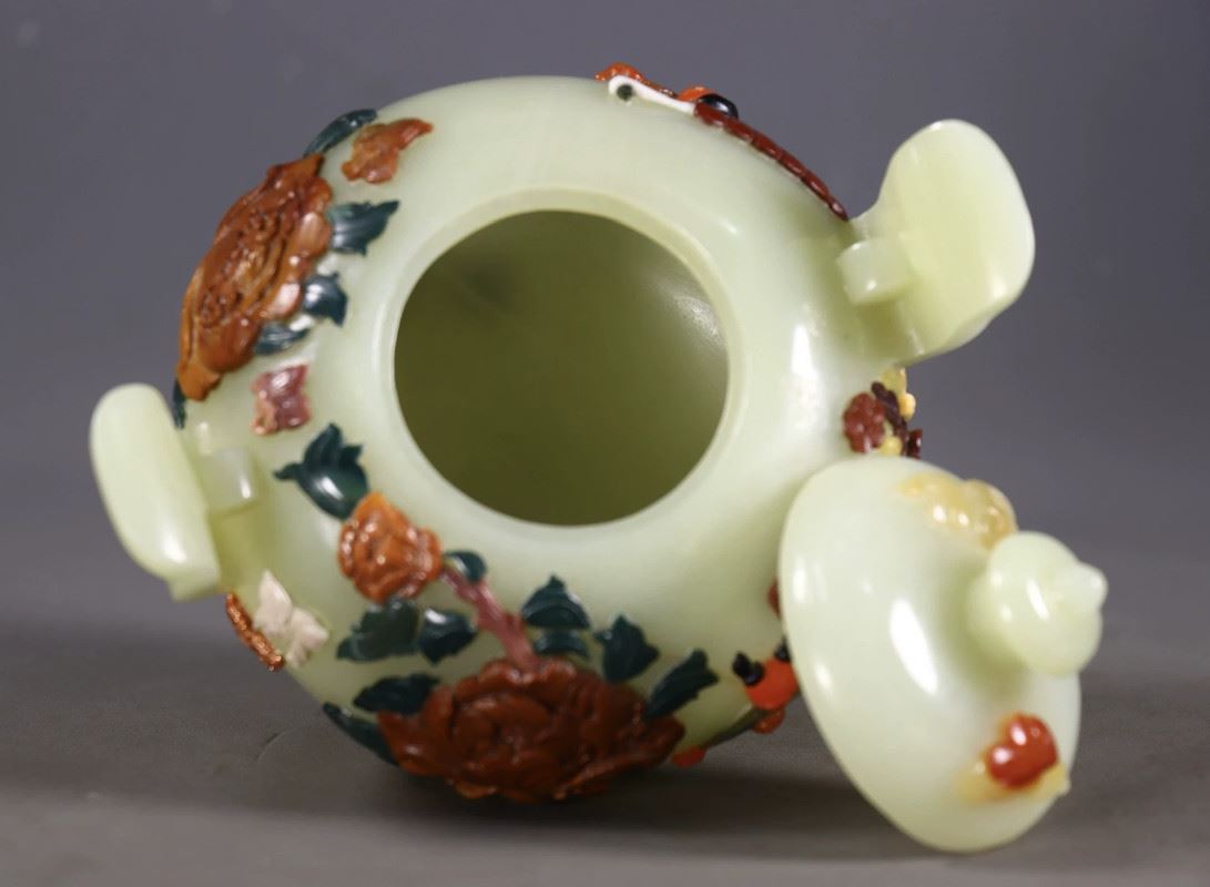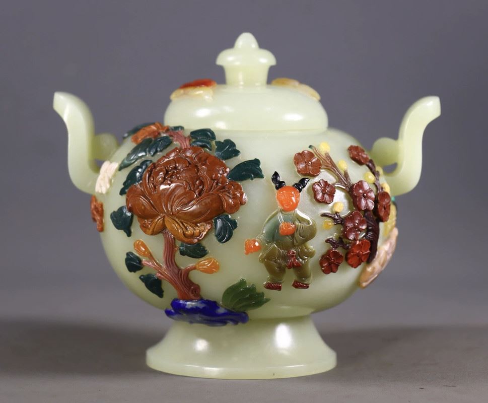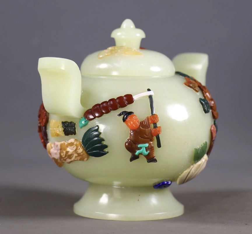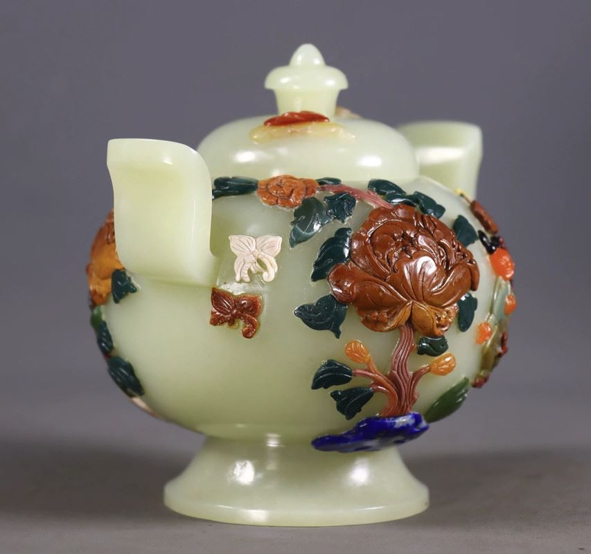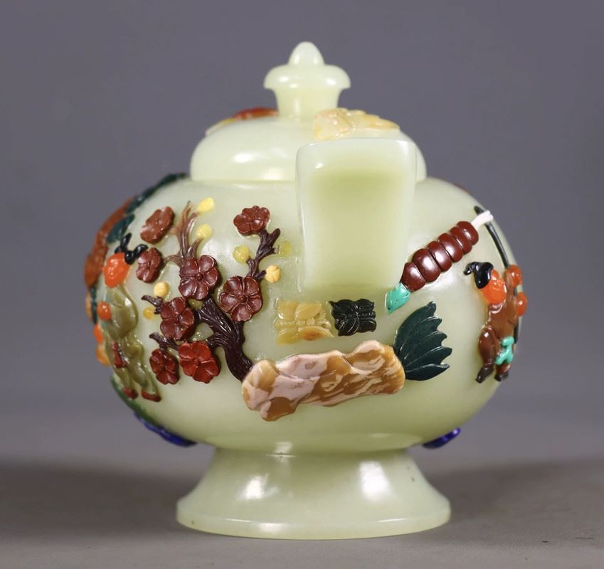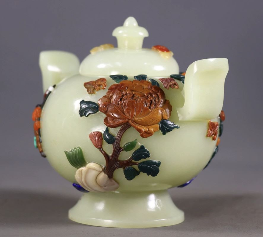 This exquisite Hetian jade ewer features high-quality Hetian jade material, with delicately carved floral patterns on its body that showcase a strong natural beauty. The flowers are inlaid with various gems, creating vibrant colors and intricate details. The spout and handle design are unique, sophisticated, and rich in traditional craftsmanship. It is a perfect piece of art, combining practicality and collectible value.