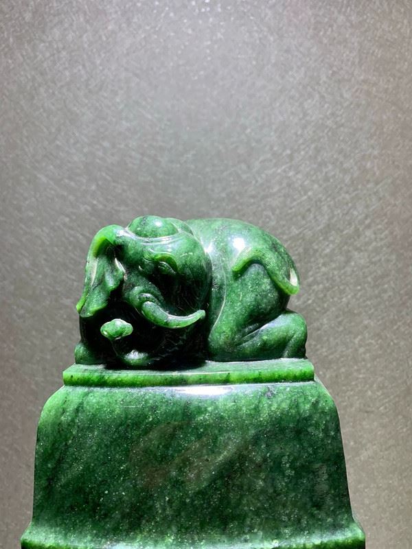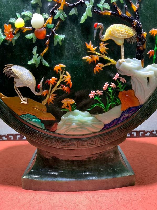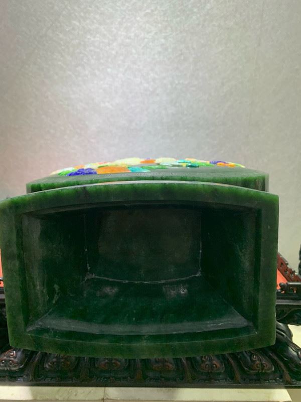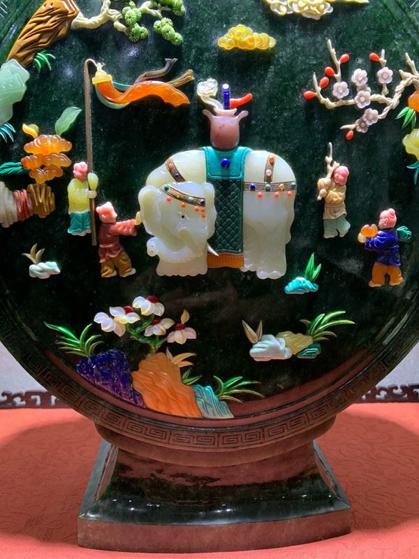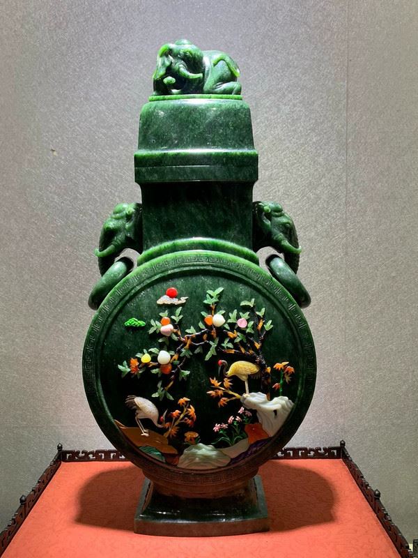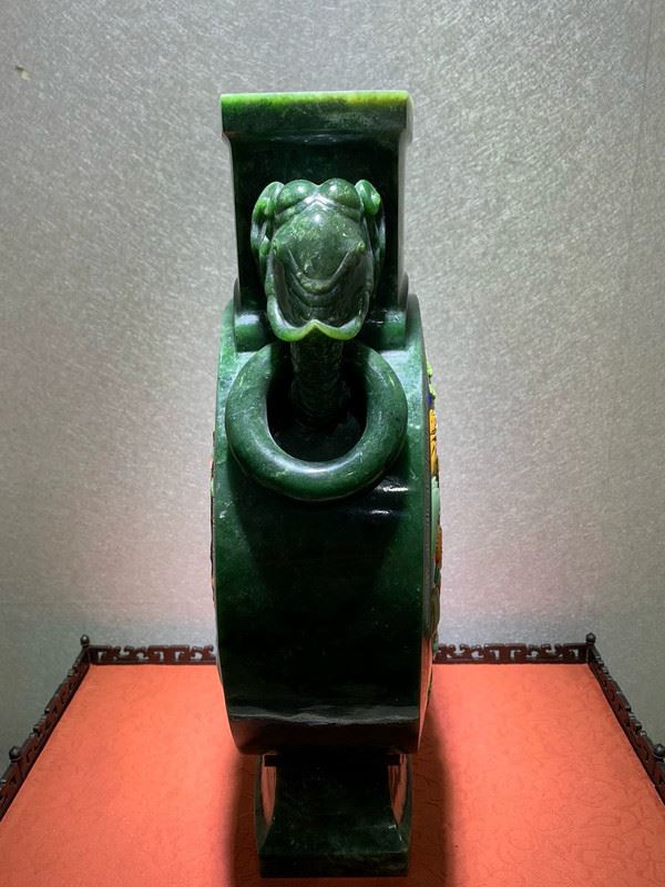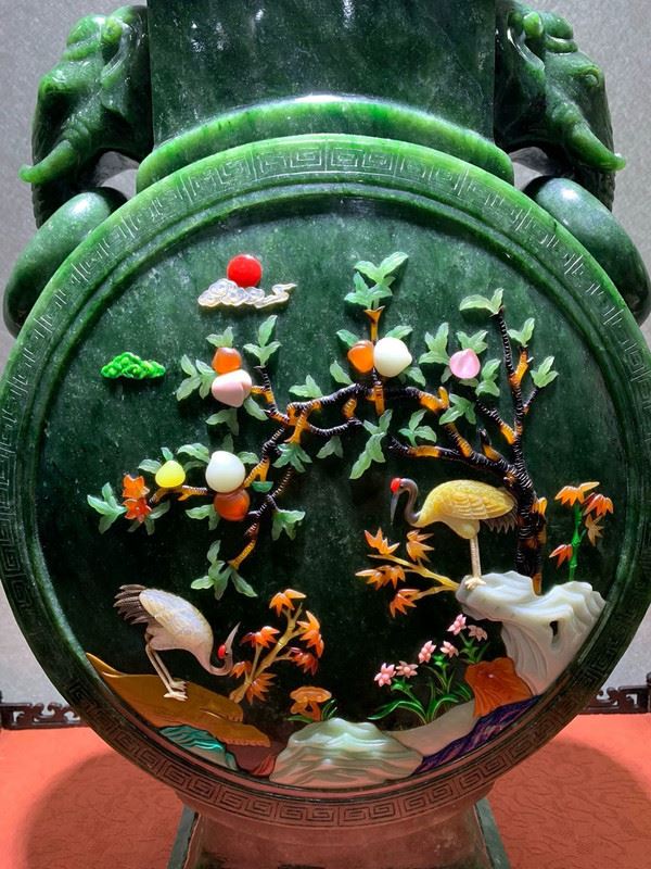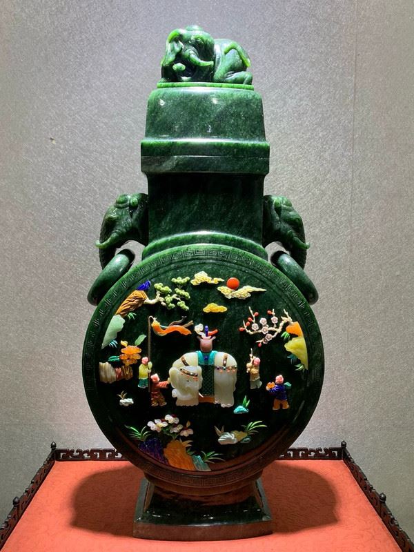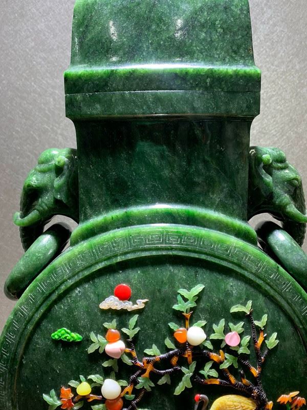 This Hetian jade inlaid with precious stones elephant ear vase combines the smooth texture of Hetian jade with exquisite inlay craftsmanship, showcasing the perfect fusion of traditional art and luxurious craftsmanship. The vase is carved from Hetian jade, smooth and delicate, with elephant ear designs adding a touch of classical elegance. The intricate inlays of precious stones and metals on the vase surface create rich patterns and details, enhancing the overall grandeur and dignity of the piece. This vase is not only a functional artwork but also a highly collectible treasure.