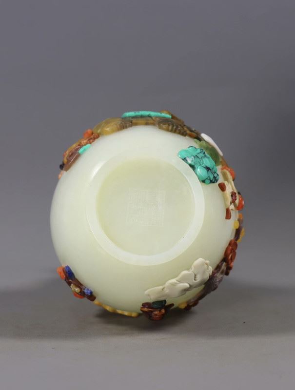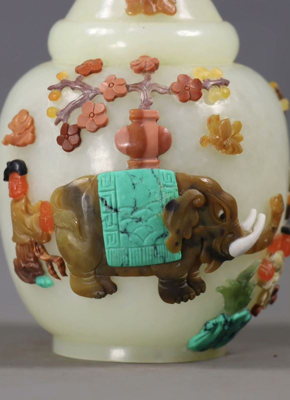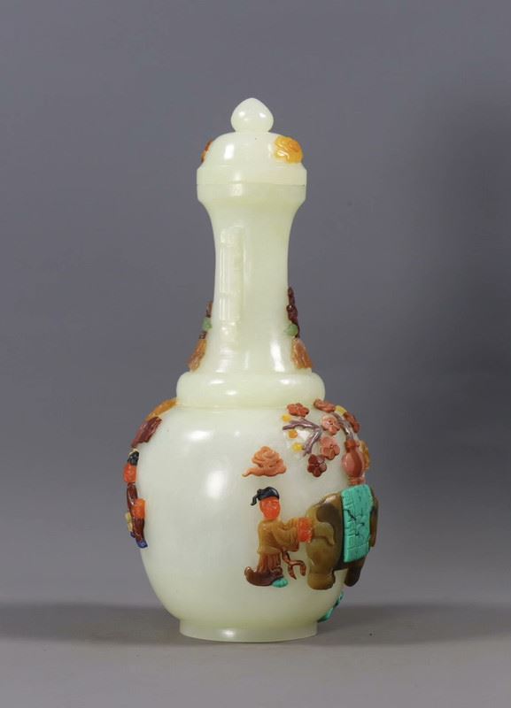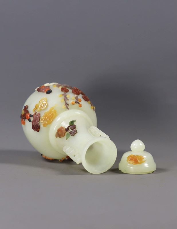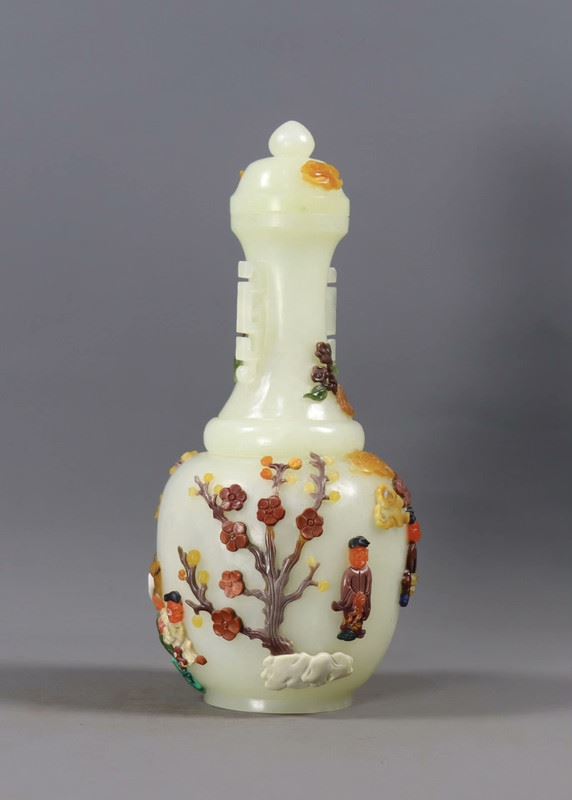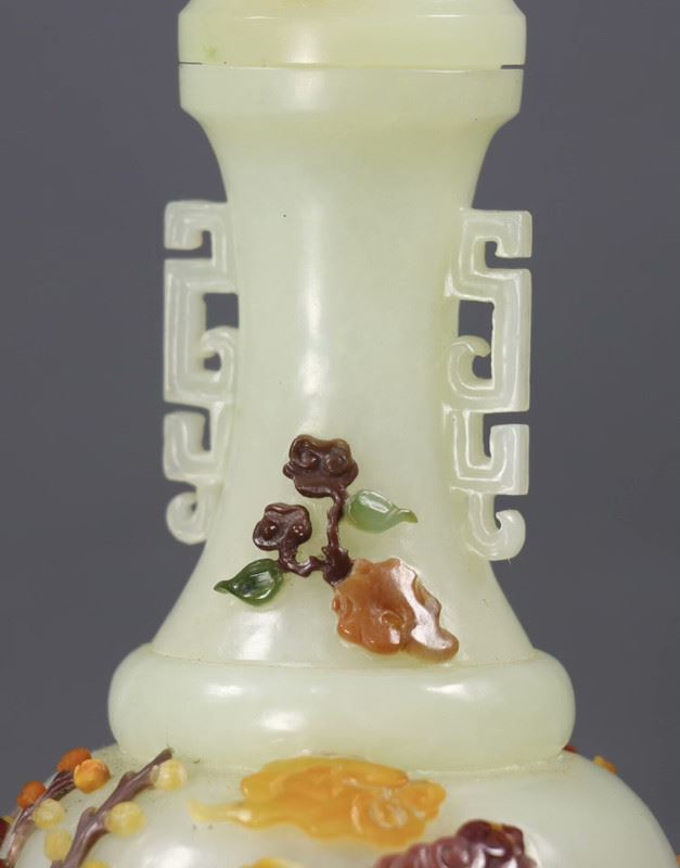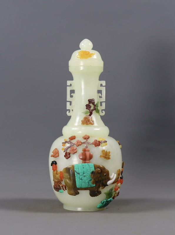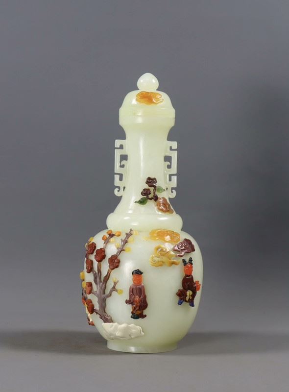 This exquisite Hetian jade scholar’s vase is crafted from high-quality jade, with a smooth and lustrous finish. The vase features intricate carvings of children at play, reflecting traditional cultural themes of innocence and happiness. The surrounding tree branches and inlaid precious stones add depth to the design, while the dual handles enhance its classic aesthetic. The vase’s elegant form and detailed craftsmanship make it both a collectible treasure and a highly valued artistic piece.