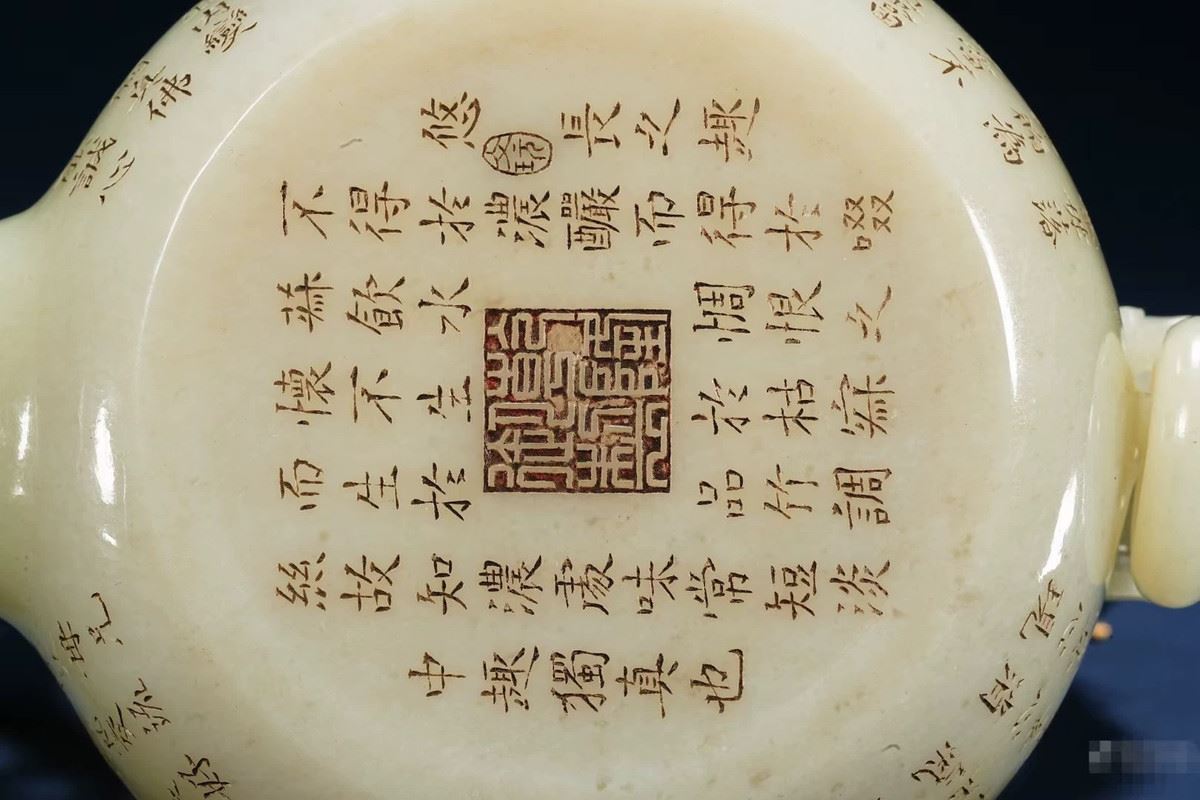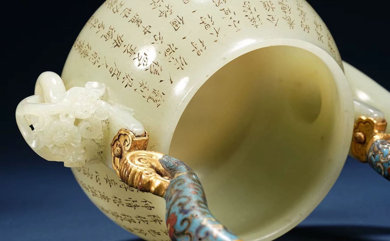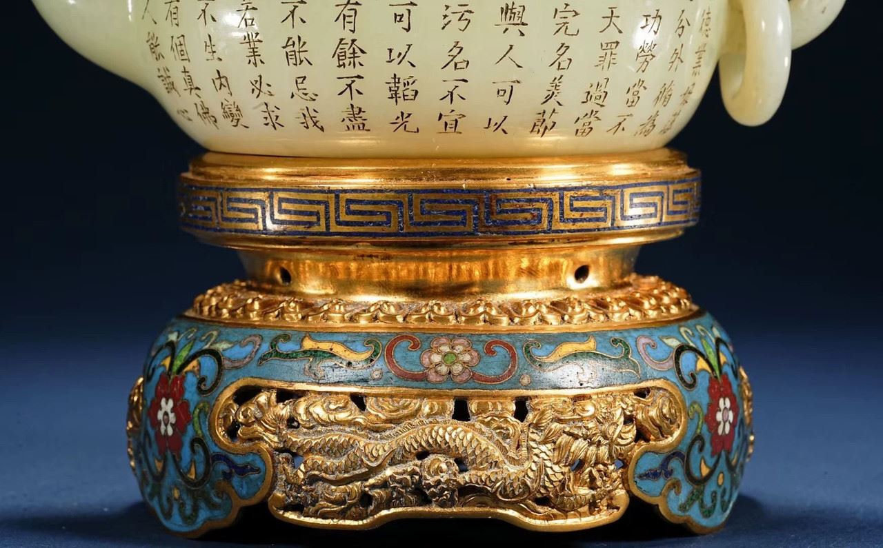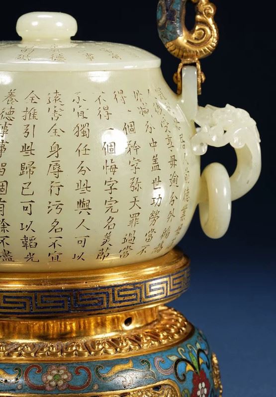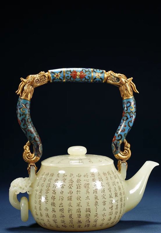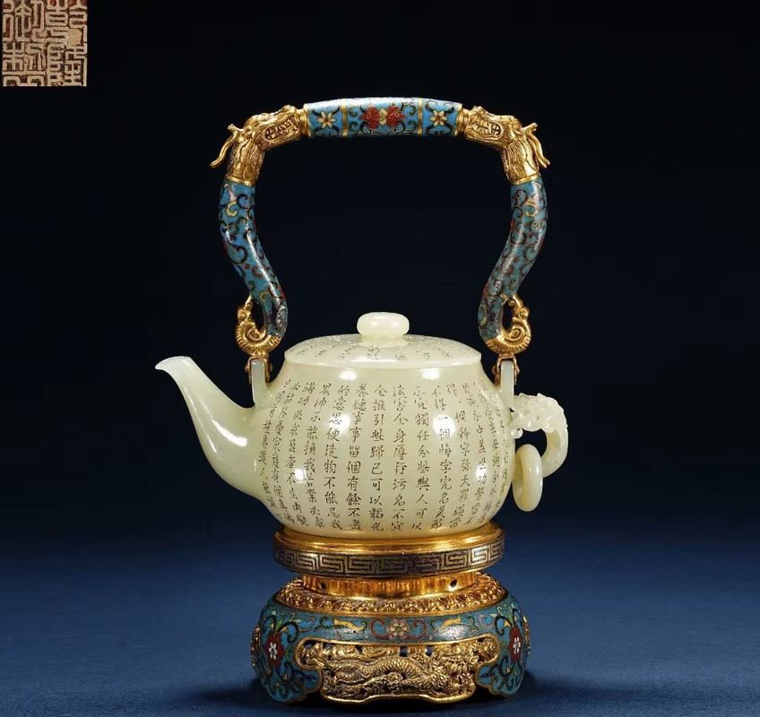 This Hetian jade teapot is exquisitely crafted from the finest Hetian jade, with elegant poetic inscriptions on the body, showcasing the profound cultural heritage of ancient scholars. The handle is adorned with copper dragons inlaid with enamel, adding to its luxurious appeal and artistic value. The base is decorated with finely carved gilt copper, demonstrating the exceptional craftsmanship.