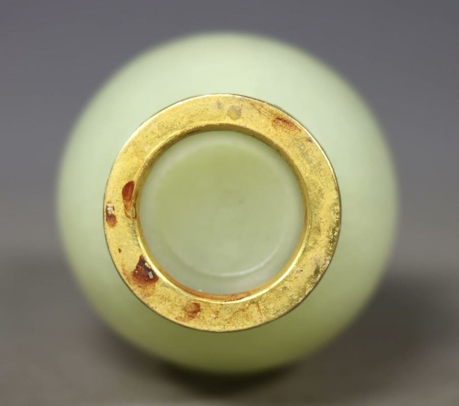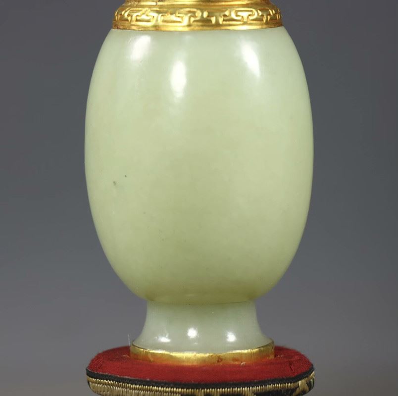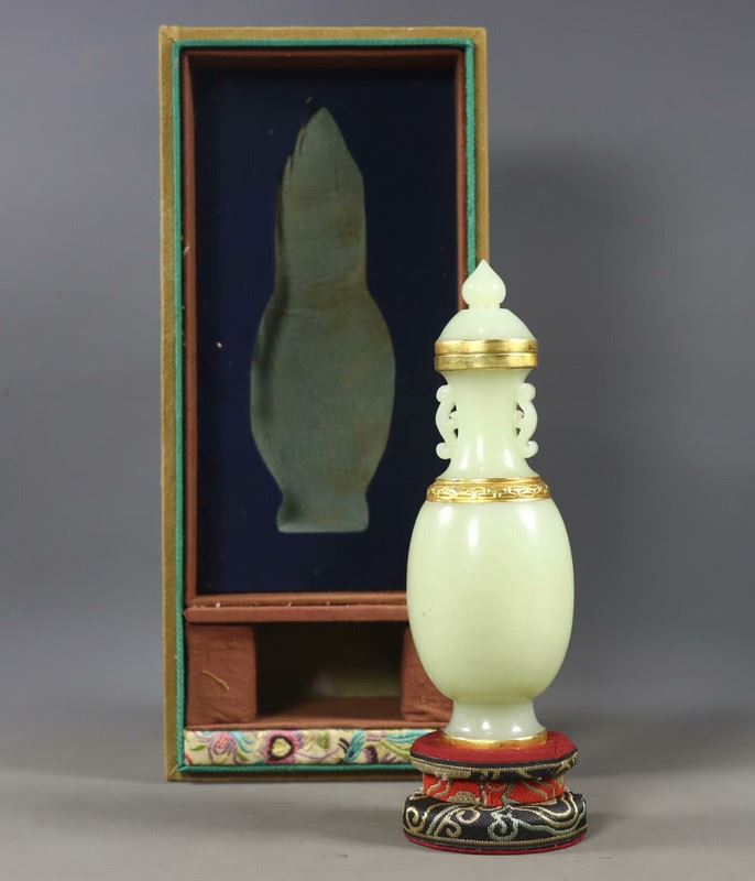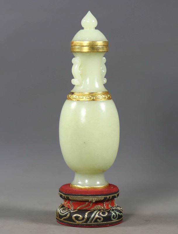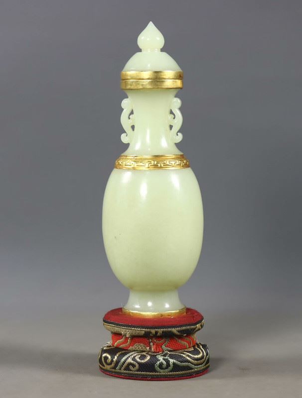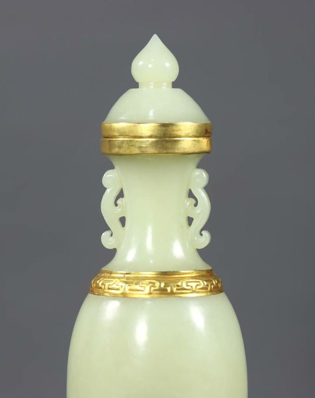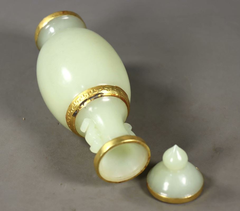 This Hetian jade vase is carved from high-quality jade, with a smooth white finish that exudes a delicate, lustrous texture. The vase features elegant golden handles on each side, where the exquisite gold craftsmanship complements the soft and refined Hetian jade. The combination of gold borders with jade enhances the luxury and visual depth of the piece. The vase's design is both classical and grand, with traditional charm, making it not only functional but also a highly valuable artistic and collectible piece.