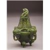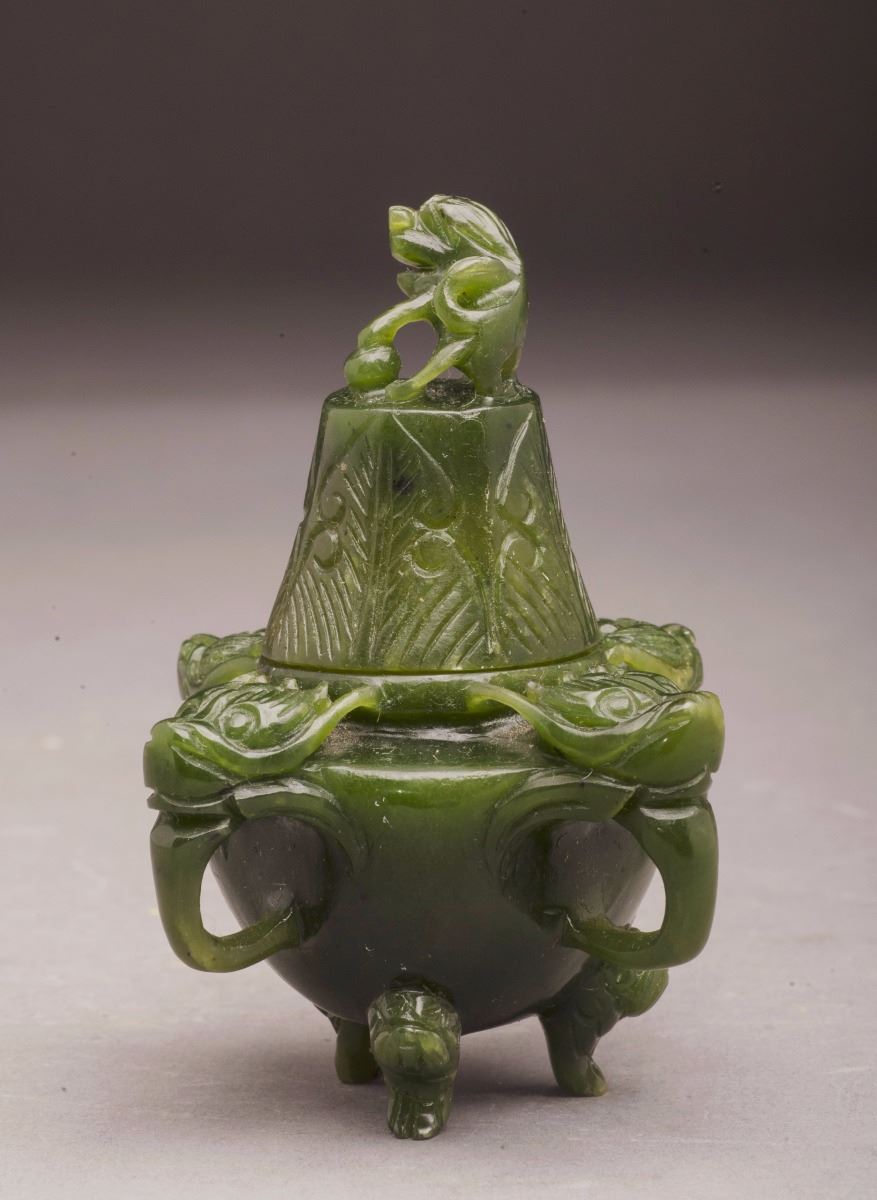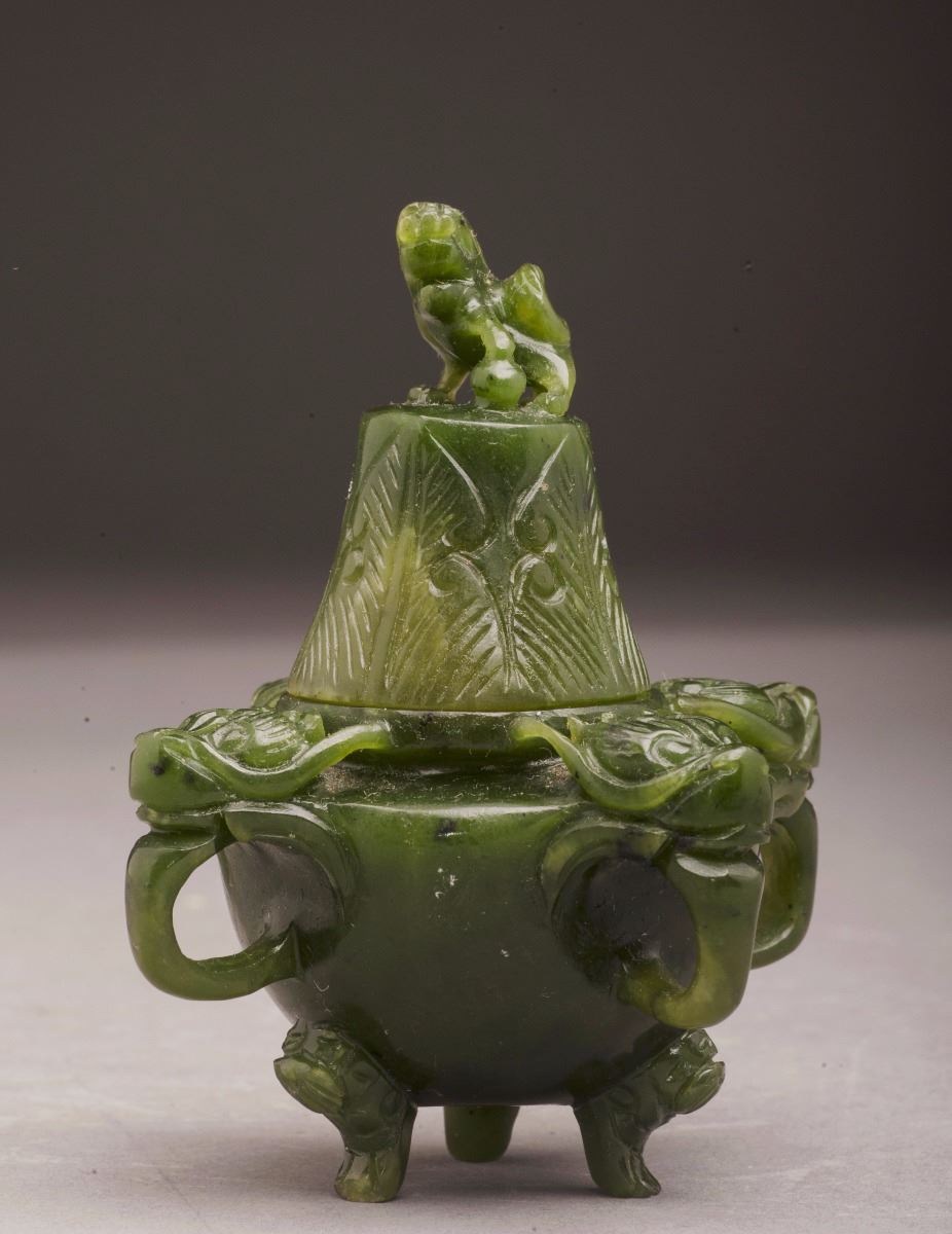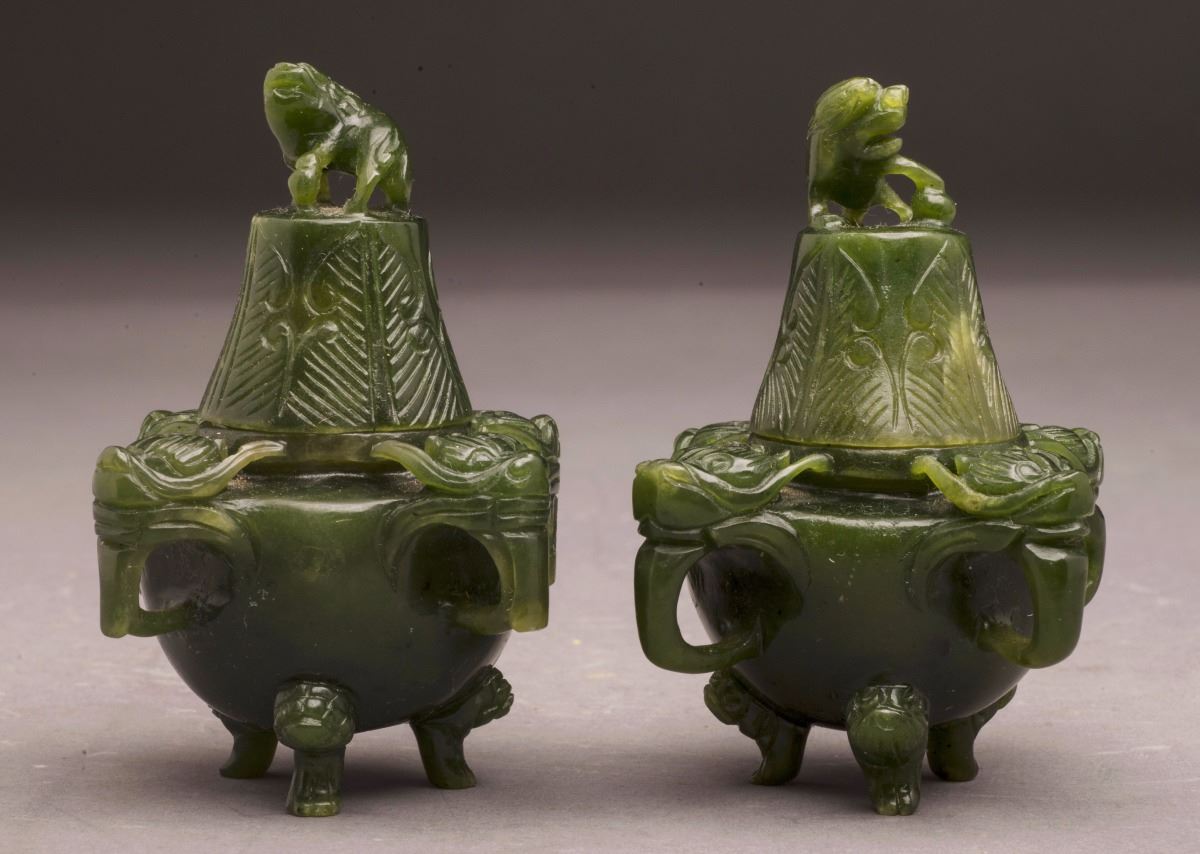 A Pair Of Fine Hetian Stone In Good Quality, Designed As The Form Of Two Vivid Incense Burner. Within The Alternative Green Tone Throughout. Craved In Extremely Detailed And Supported By Three Conical Legs At Bottom.