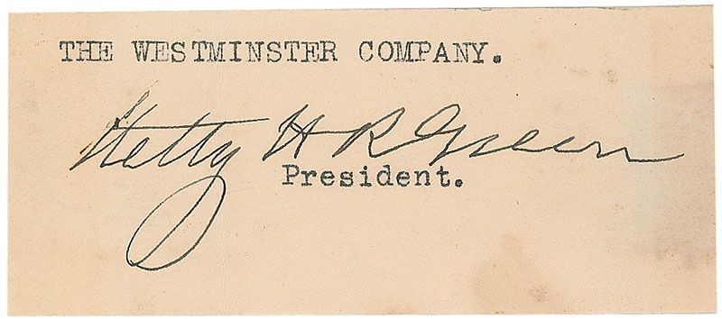 Businesswoman (1834–1916) known for being the first American woman to make a substantial impact on Wall Street. Ink signature, “Hetty H R Green,” on an off-white 3.75 x 1.75 slip clipped from the closing of a letter which she signed as President of the Westminster Company. Finally realizing that the volume of her financial affairs had grown too great for her to handle alone, the elderly Green founded the Westminster Company in 1910 with her son, enabling him to assume active management of her massive holdings. In fine condition, with a light vertical fold through a single letter of signature, a bit of light toning, and a tape remnant to reverse.