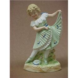 Heubach German porcelain figurine, girl with blonde hair, intaglio eyes, green dress with blue sash, tambourine at her feet, 11 1/4" high, Heubach mark and Made in Germany