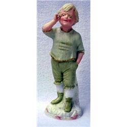 Heubach German porcelain figurine of boy with spectacles in green shirt, knickers and shoes, 9 1/2" high