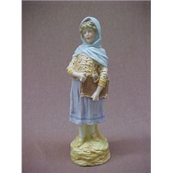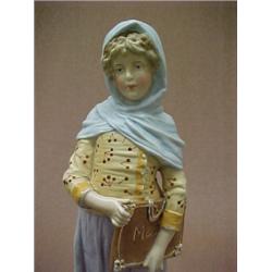Heubach German porcelain figurine of girl with light brown hair, intaglio eyes, holding "Music" portfolio under arm, 12" high, impressed number 30 inside base