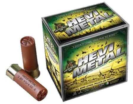 Mfr Items:Hevishot Category:SHOTSHELL STEEL LOADS Gauge:12 Gauge Type:Hevi-Metal Length:3" Ounces:1-1/4 oz Shot Size:4 Muzzle Velocity:1500 fps Rounds Per Box:25 Shot Type:Steel
