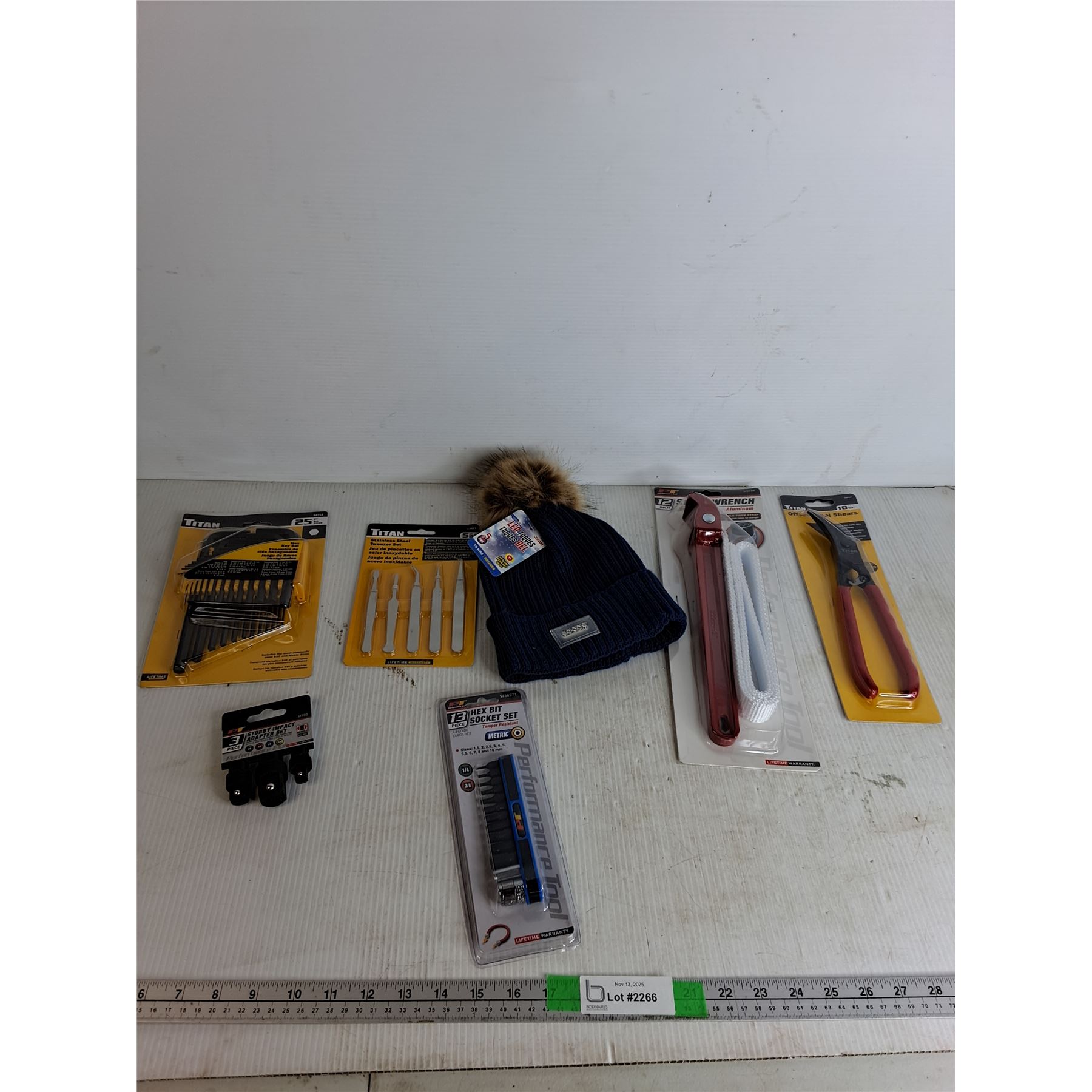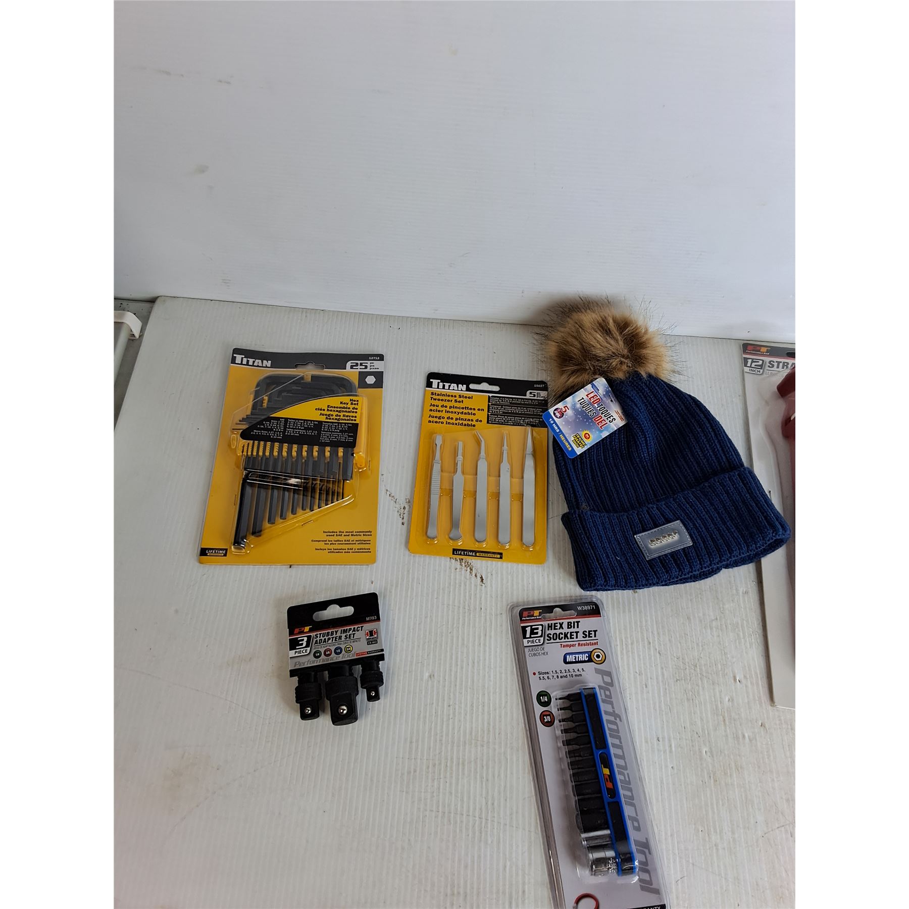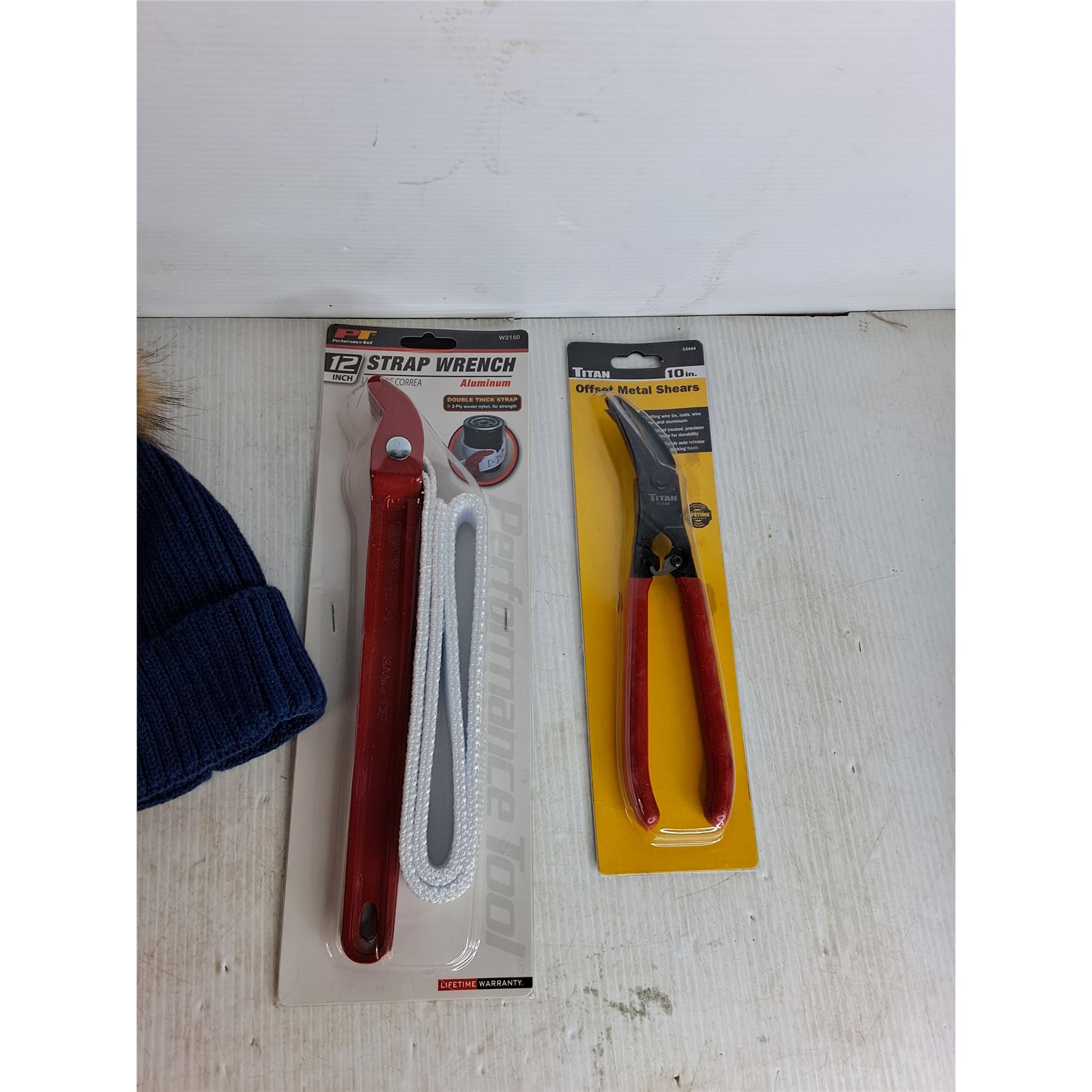 Hex Key Set, Stainless Steel Tweezer Set, Blue LED Toque, 12" Strap Wrench, Offset Metal Shears