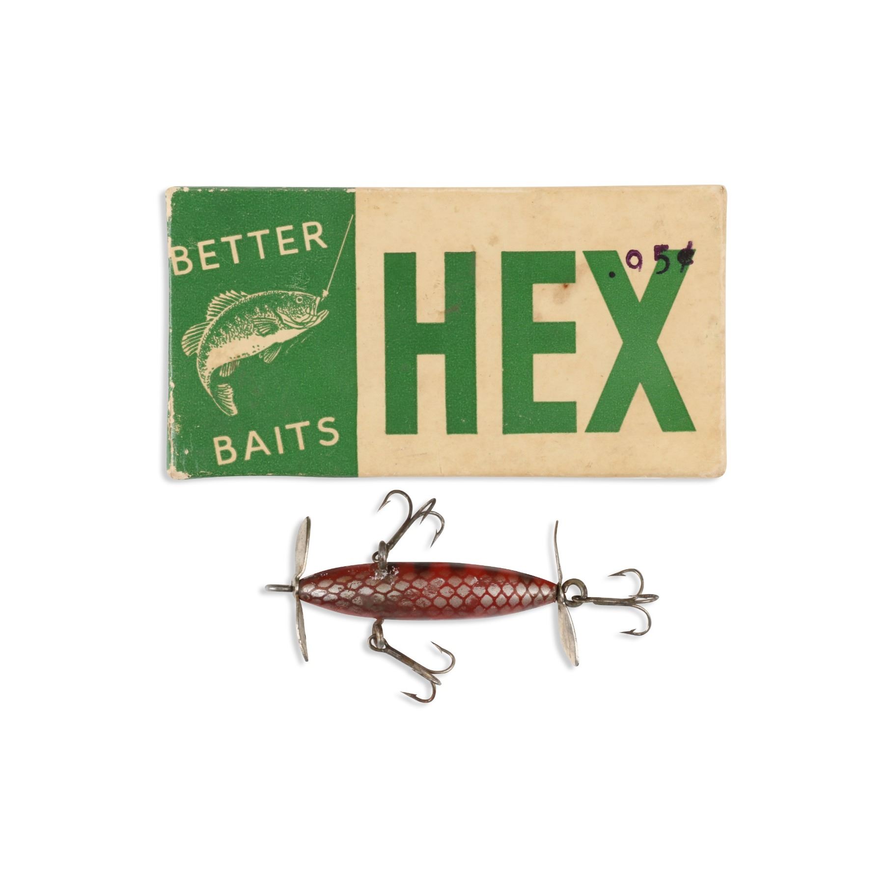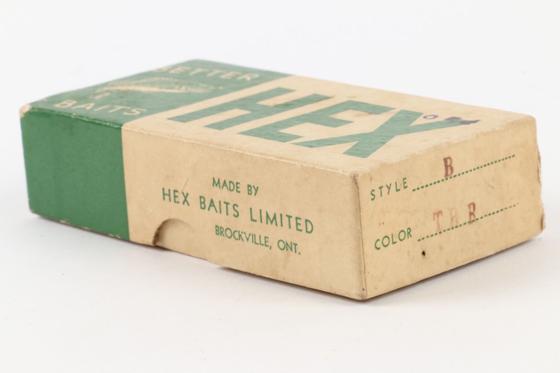 Hex Baits Limited, Canada. 1940s. Boxed. Material: Plastic. Quantity: 1. Grade: VG. 4.25" box Est. $100-125.