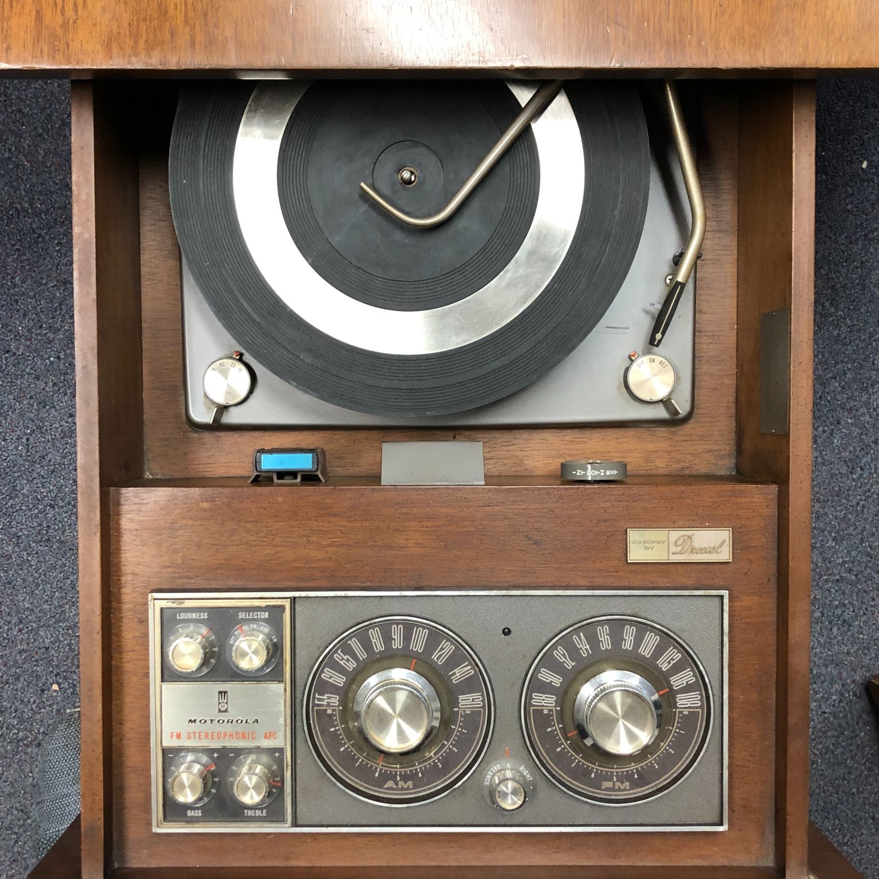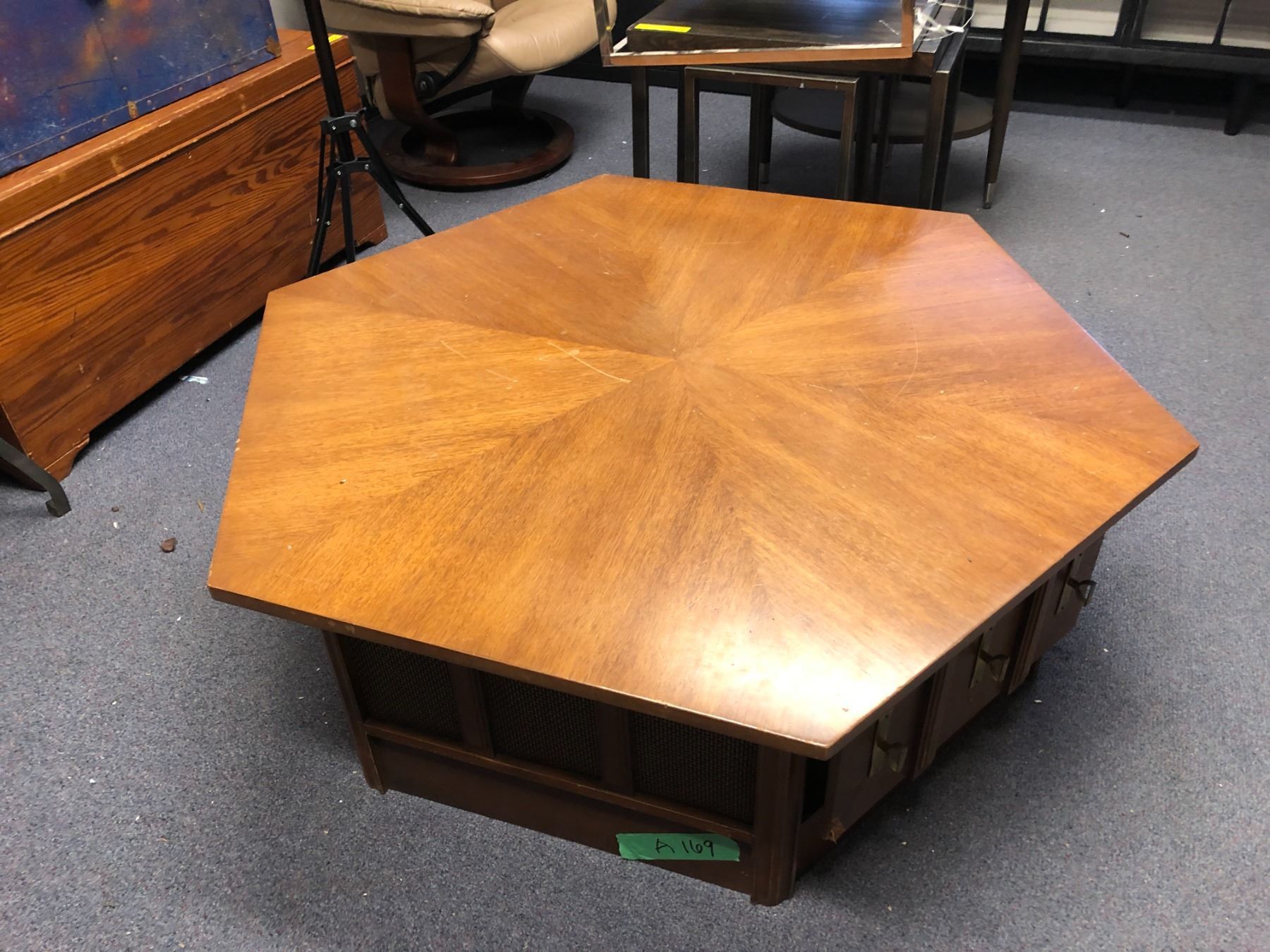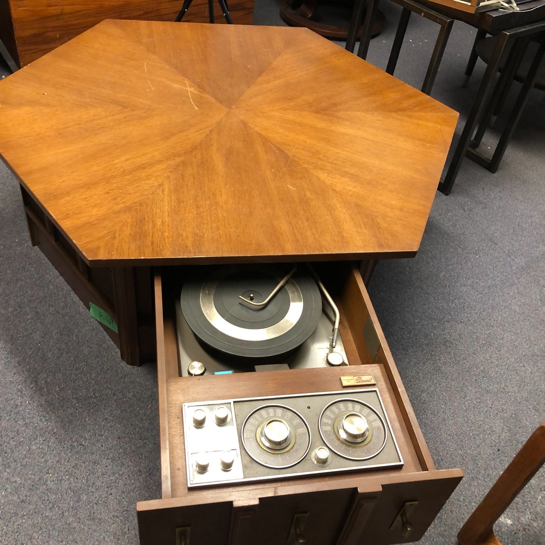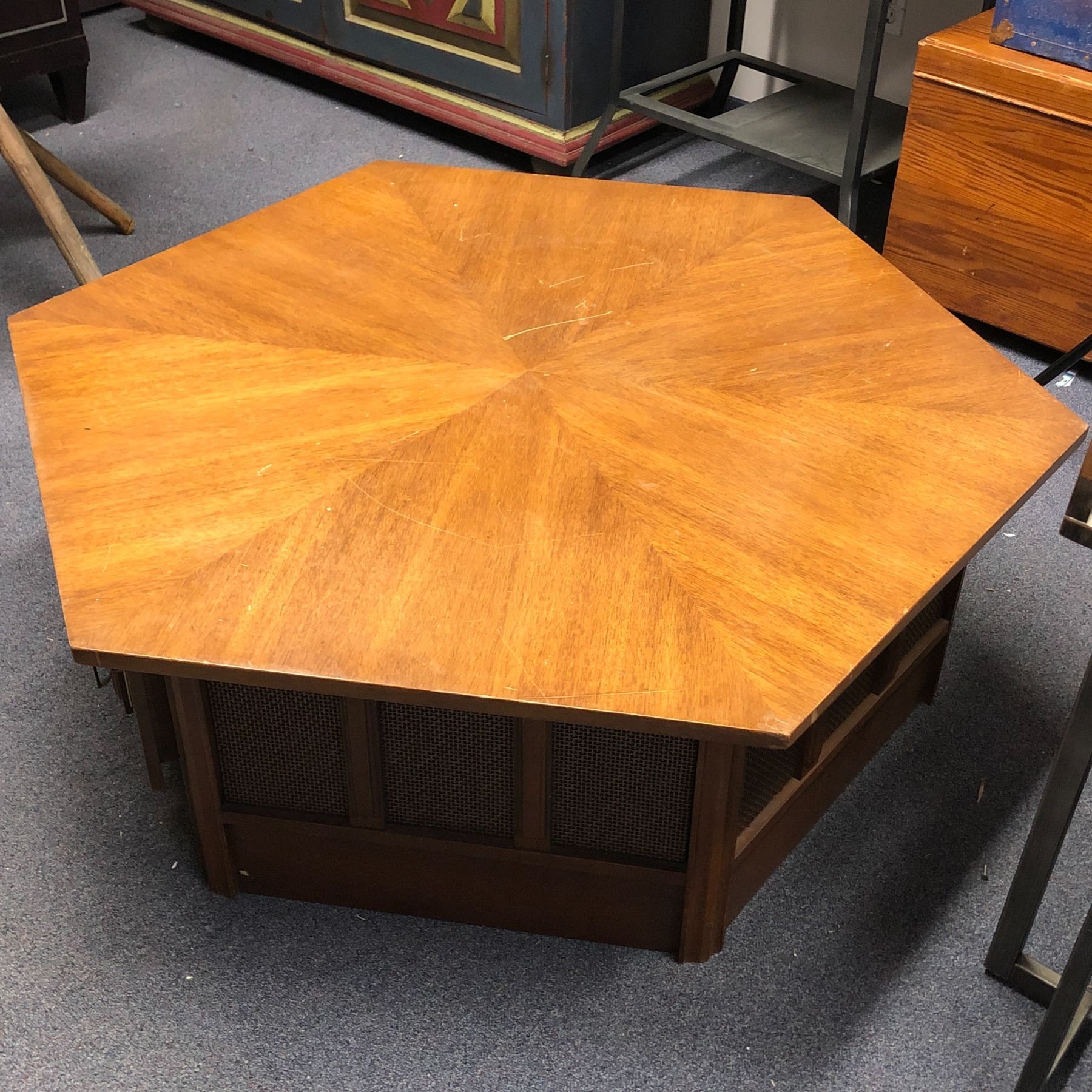 Hexagon shape cabinet by Drexel w/ built-in Motorola SD195AD record player - approx. 51in wide x 44in depth x 17in height