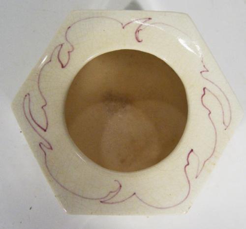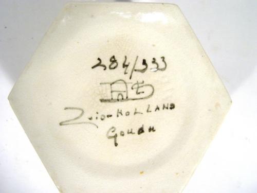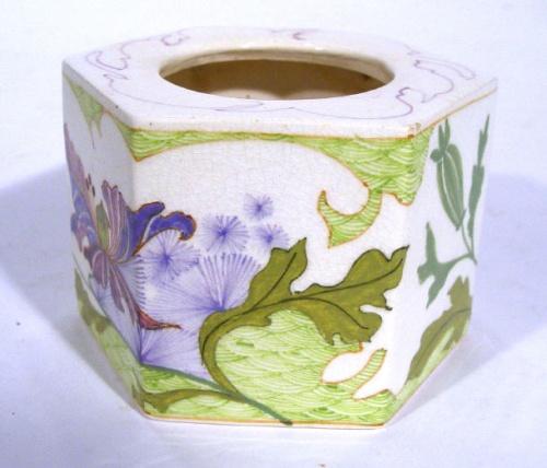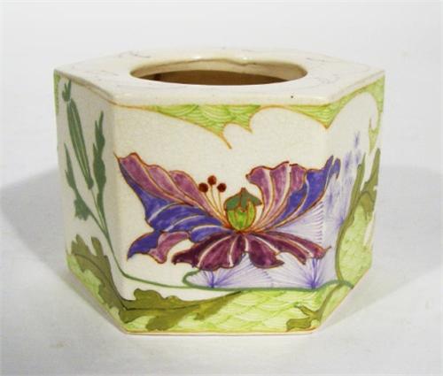 Hexagonal Gouda pot hand painted with a continuous band of Art Nouveau style flowers, painted factor