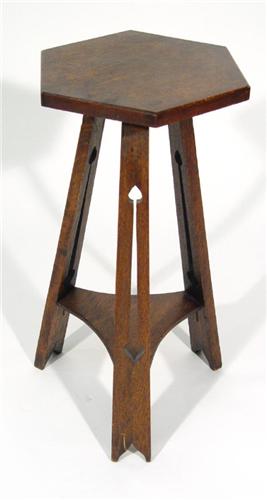Hexagonal oak Art Nouveau occasional table with under-tier, 68cm high, 33cm wide