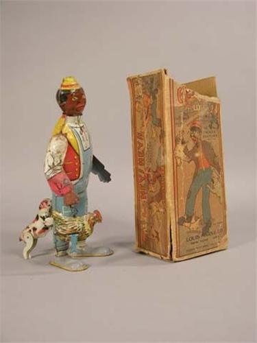 "Hey Hey the Chicken Snatcher" tin toy 9" tall, 1926 keywind toy shows some minor scratches. Box missing top.