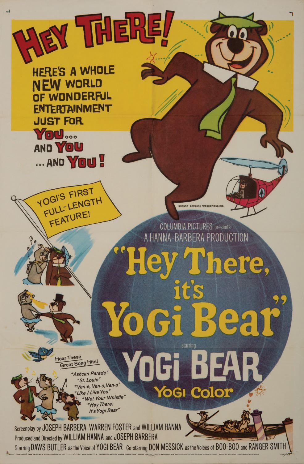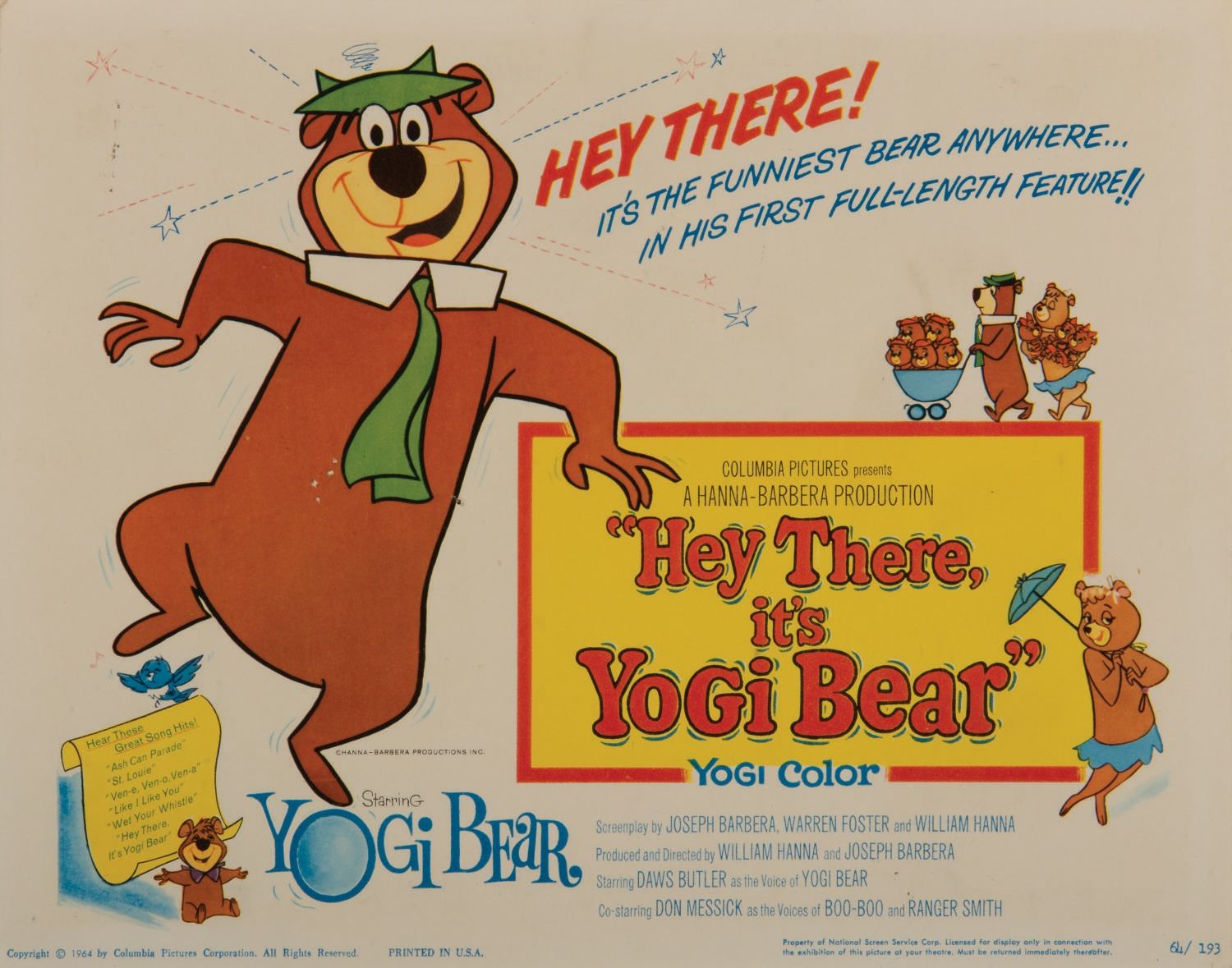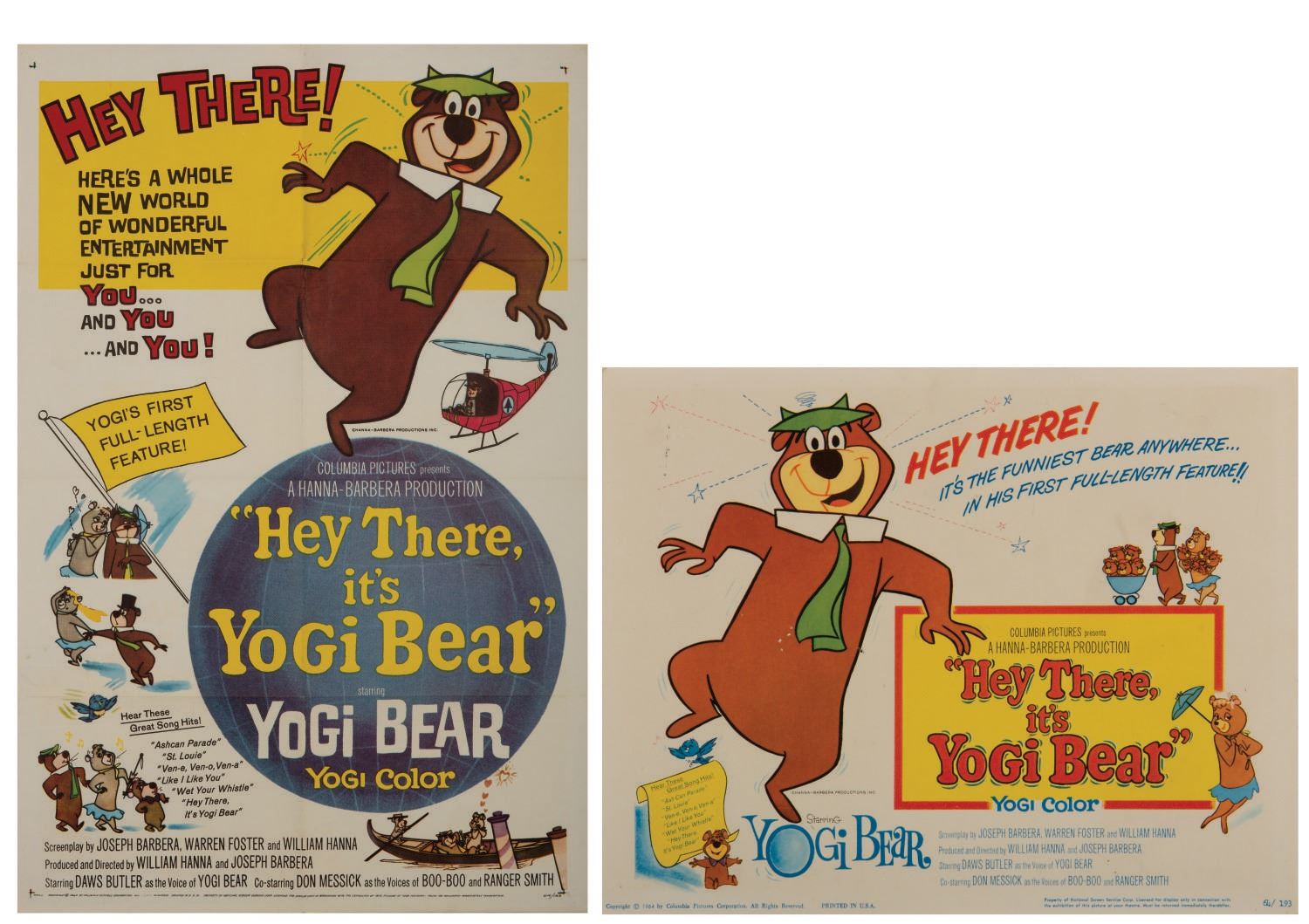 (Columbia, 1964) A one sheet poster and lobby card for Hanna- Barbera's first theatrical film, "Hey There, it's Yogi Bear." The lobby card measures 11"x14" and the poster measures 27"x41". Both are in very good overall condition with a few pinholes to the lobby card and minor wear.
