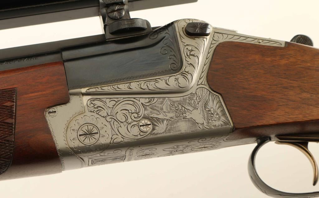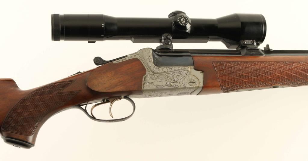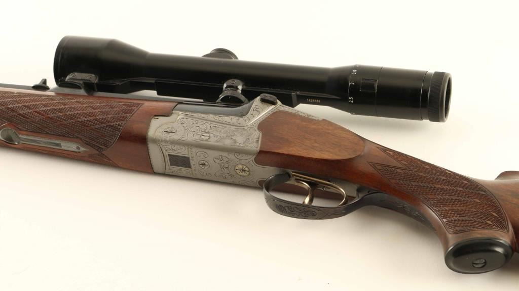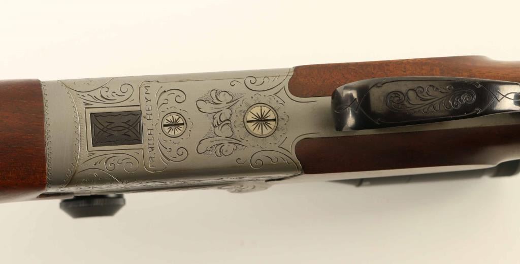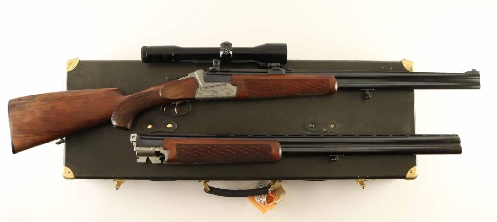Superb quality over/under boxlock double rifle & double barrel shotgun, factory two barrel set with 9.3x74/9.3x74Rmm & 12/12 Gauge barrels. Manufactured in West Germany circa 1977 by Friedrich Wilh. Heym. Configuration: French greyed fancy back receiver with black leaf scroll & game scene engraving including two ducks on the left side & two hare on the right side, selective automatic ejectors, blued 25" barrels with solid sighting rib & double Kersten locks, raised blade front sight, dovetailed rear sight, claw mounted Zeiss Diavari-Z 1.5-6x 42mm scope with #1 reticle, double triggers with single set trigger in front, brass cocked indicators, sliding tang safety, knurled top lever, sling swivels,skip-line checkered select walnut forend with Deeley release and pistol grip shoulder stock with black grip cap, beaded right handed cheekpiece & black serrated buttplate. Includes an Emmebi green leather wrapped locking trunk case with green partitioned interior containing the factory 9.3x74R test target and 2 3/4" chambered 12 gauge barrels with forend. The receiver exhibits approximately 99% of it's original finish showing some bright slide wear from the tang safety and minor losses. The rifle barrels retain approximately 99% of their blued finish showing a couple small spots of light rust on the underside of the bottom barrel. The 28" full/cylinder fixed choke shotgun barrels nearly mirror the condition of the rifle barrels with approximately 99% bluing showing two small spots of pin prick pitting on the underside of the bottom barrel. Action is tight, the rifle bores are pristine, shotgun bores are pristine, the optics are sharp and the satin finished figured wood stocks are extra fine. Condition is NRA Good to Very Good. ***Modern Firearm*** [From the Jim Wilkinson Rifle Ranch Collection]