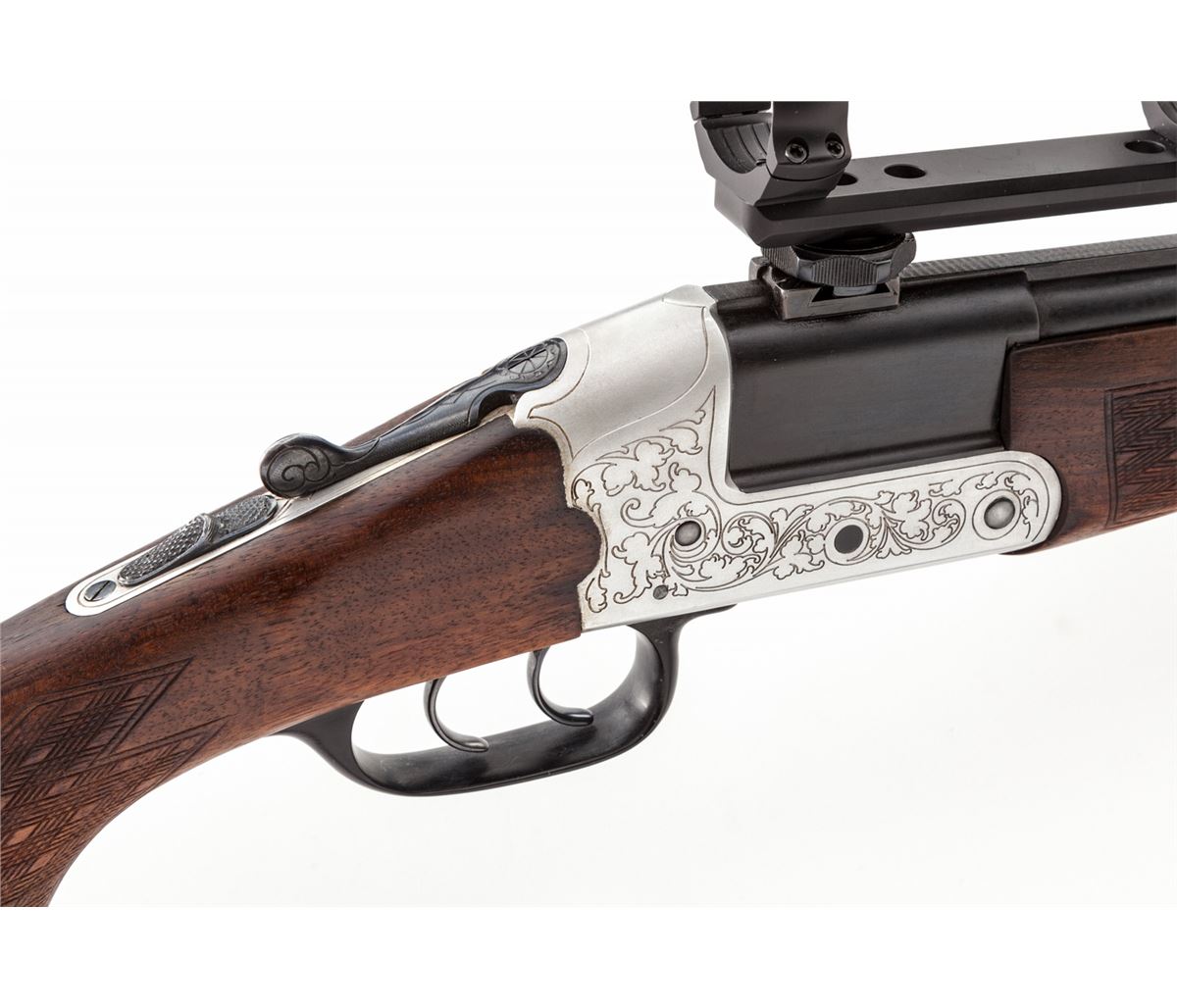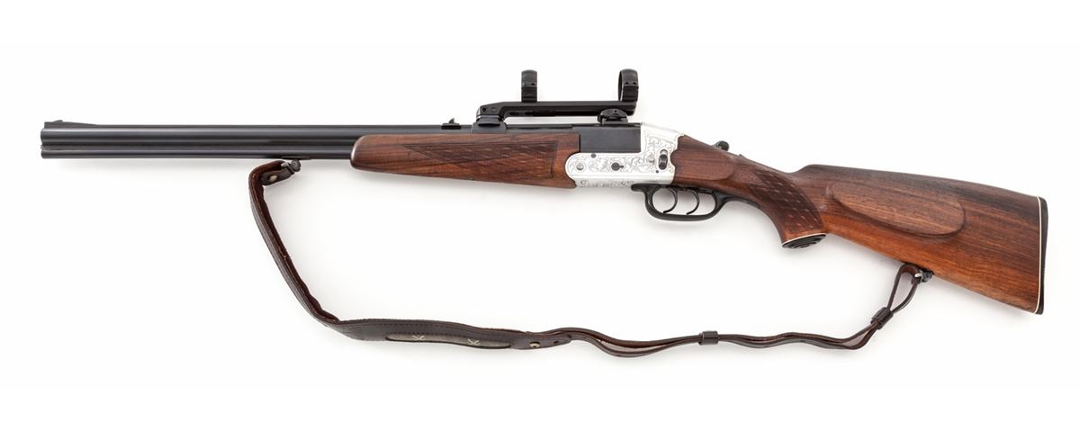 Heym Over/Under Combination Gun, #01148, 20 ga./.222 Rem. cal., 23-1/2'' matte barrels, roll engraved bright aluminum frame, selectable double set trigger, skipline checkered cheekpiece walnut stock and forend, with scope mounts, 1'' rings and commercial leather sling. Condition is excellent showing little use. Stock with very light impressions. Barrel assembly may have been refinished a matte black at one point. Crisp action, bright bores. Est.: $500-$750. (Modern)