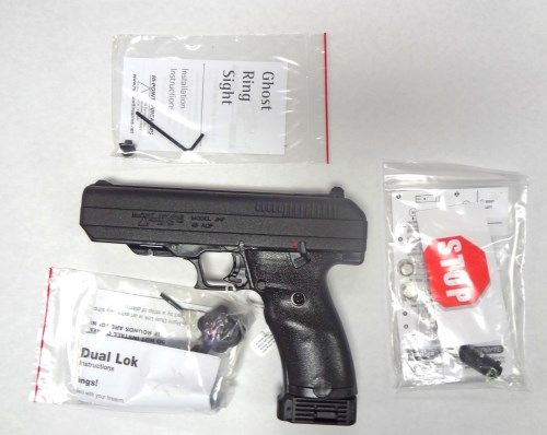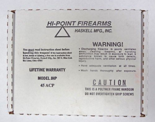 Hi Point 34511L Model JHP-L .45 ACP Pistol. Action: double action. Caliber: .45. Automatic Colt Pistol Barrel Length. Capacity: 9+1. Safety: thumb grips.