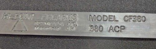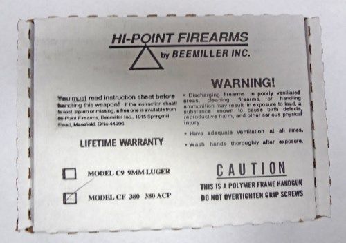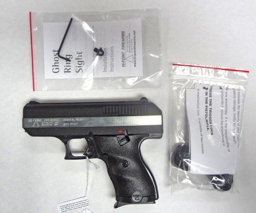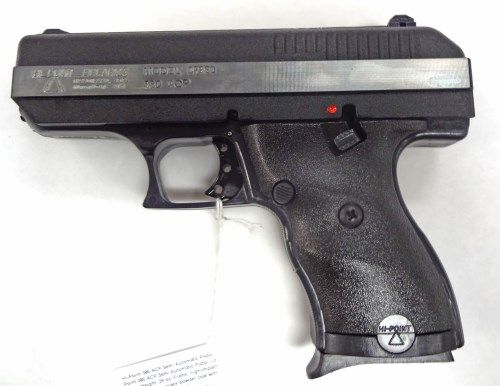 Hi-Point 380 ACP Semi Automatic Pistol. Length: 6.75". Weight: 29 oz. Frame: high-impact polymer. Finish: plack powder coat with chrome rail. Capacity 8+1. Sights: 3 dots, fully adjustable.