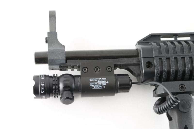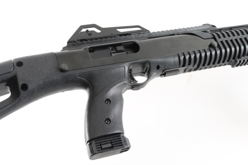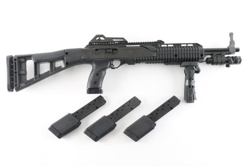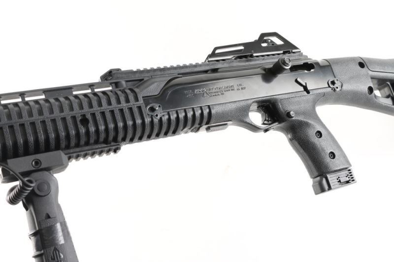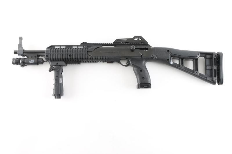 American made semi-automatic rifle chambered in .45 Automatic. Features a 17.5" blued barrel, hooded post front sight, shrouded adjustable rear aperture sight, push button magazine release, manual safety, and skeletonized black polymer shoulder stock with three integral weaver style rails, texture pistol grip & internal recoil buffer buttplate. Comes with a UTG folding post foregrip, an "Armed Forces Laser Sight Module" (Green) and four (4) magazines total. 1 Hi-Point 9 round and three (3) ProMag 14 round magazines. Bore looks great, finish looks great with little to no sign of handling. Condition is NRA Excellent ***Modern Firearm***
