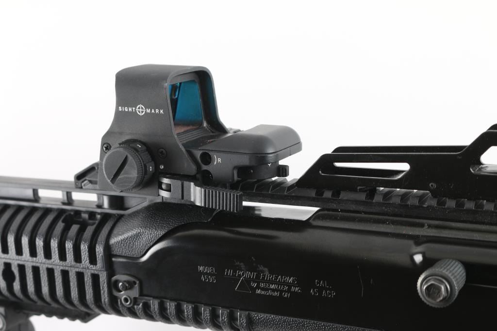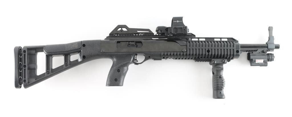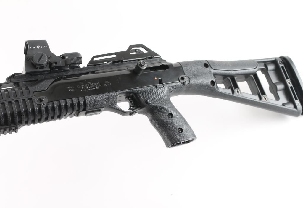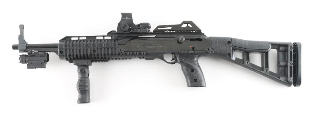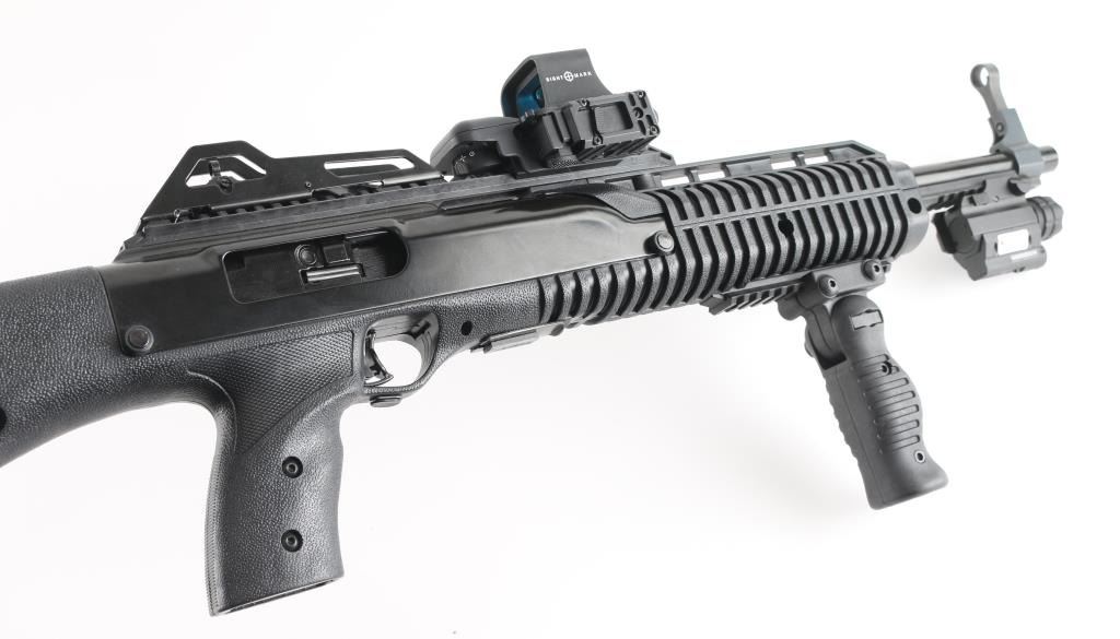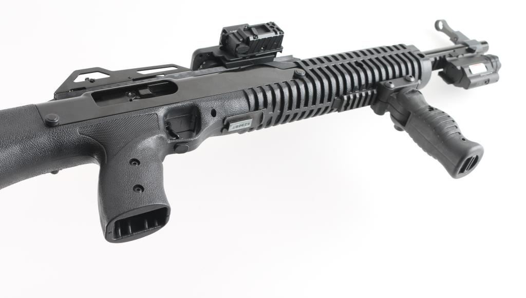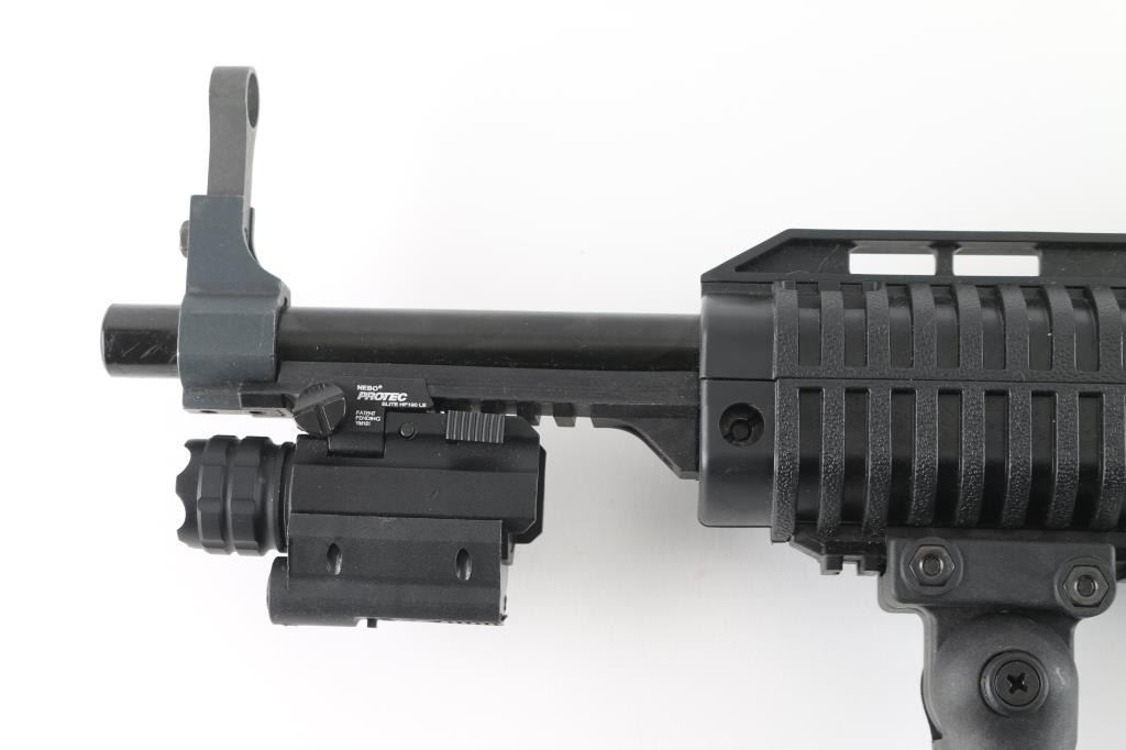 American made semi-automatic rifle chambered in .45 Automatic. Features a 17.5" blued barrel, hooded post front sight, shrouded adjustable rear aperture sight, push button magazine release, manual safety, and skeletonized black polymer shoulder stock with three integral weaver style rails, texture pistol grip & internal recoil buffer buttplate. Comes with a folding post foregrip, an "Sight Mark Laser Sight Module" (needs battery), and a Nebo Protec flashlight on the barrel rail. Bore looks great, finish looks great with minor scratches. No magazine. Condition is NRA Near Excellent Modern Firearm
