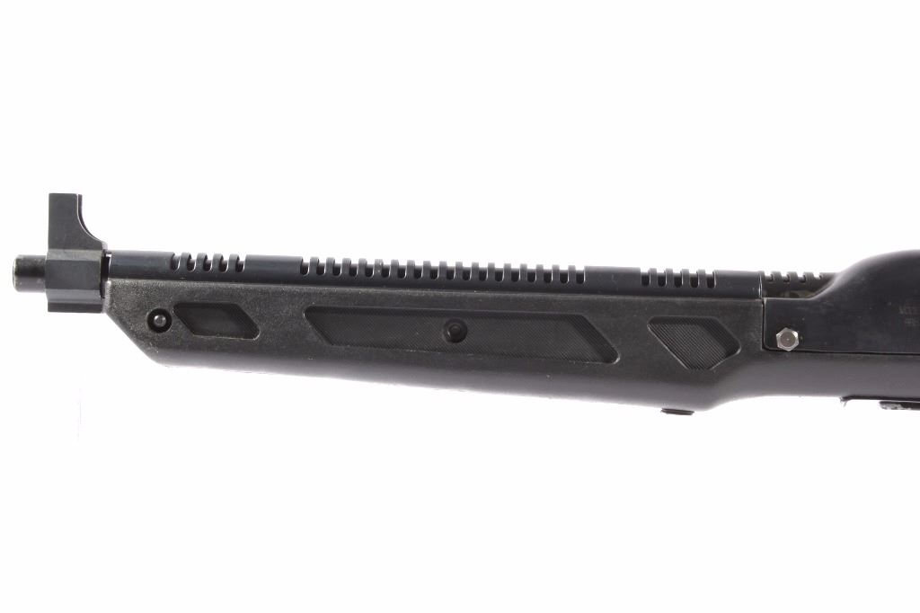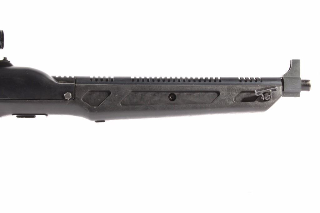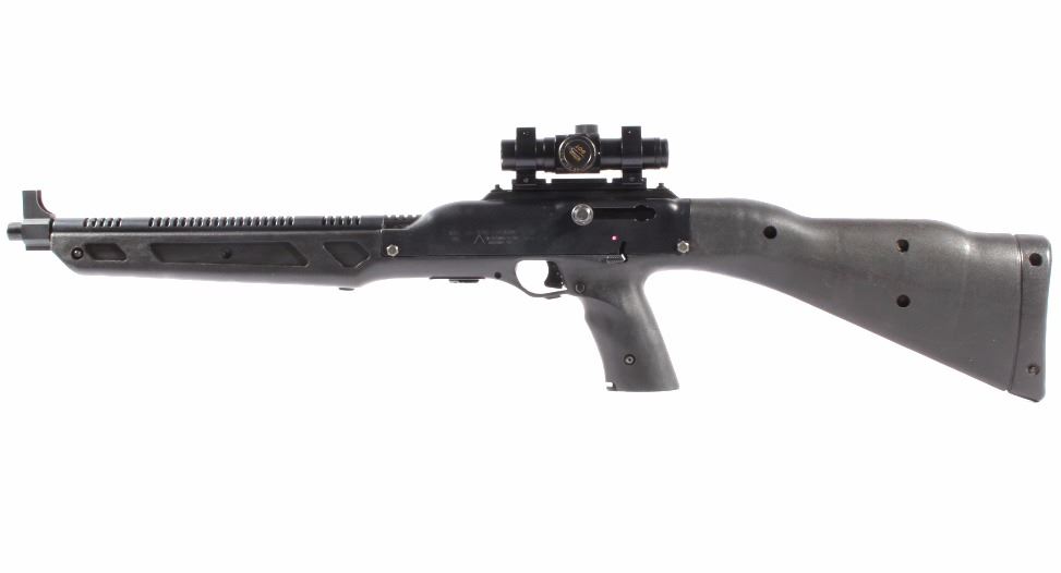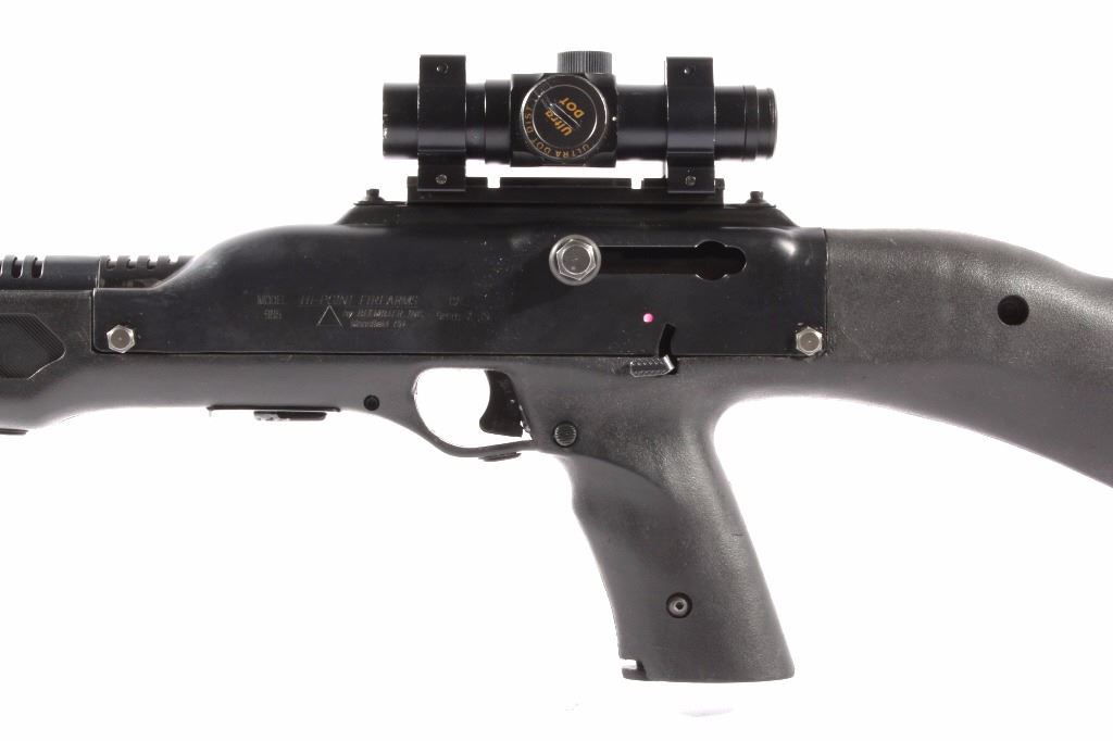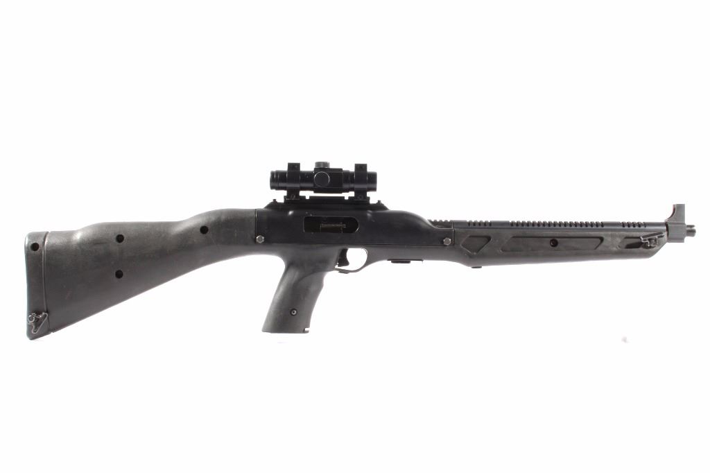 This lot features a Hi-Point Model 995 9mm Carbine with a red dot scope. The carbine features a 16 5/8" barrel, 10 round magazine, red dot scope, and polymer stock. The Hi-Point carbine was developed for the civilian market and not specifically aimed at police department use. Nevertheless, it has been approved and purchased by a small number of local police departments that cannot easily afford to outfit all of their officers with more expensive long guns. The carbine is in good condition, with few signs of wear. This is a modern rifle and requires a FFL transfer or NICS background check. The serial number is A17711. The overall length is 31 1/4"