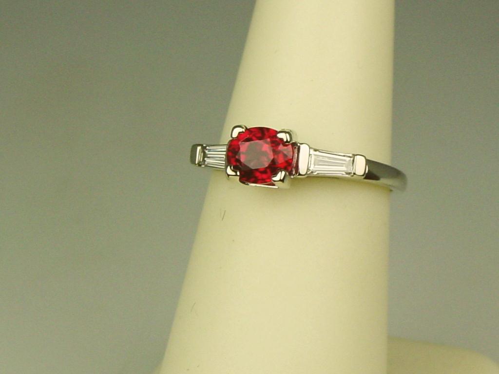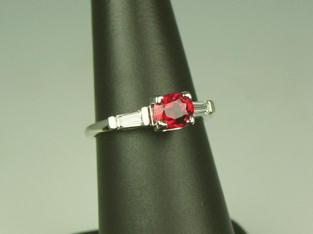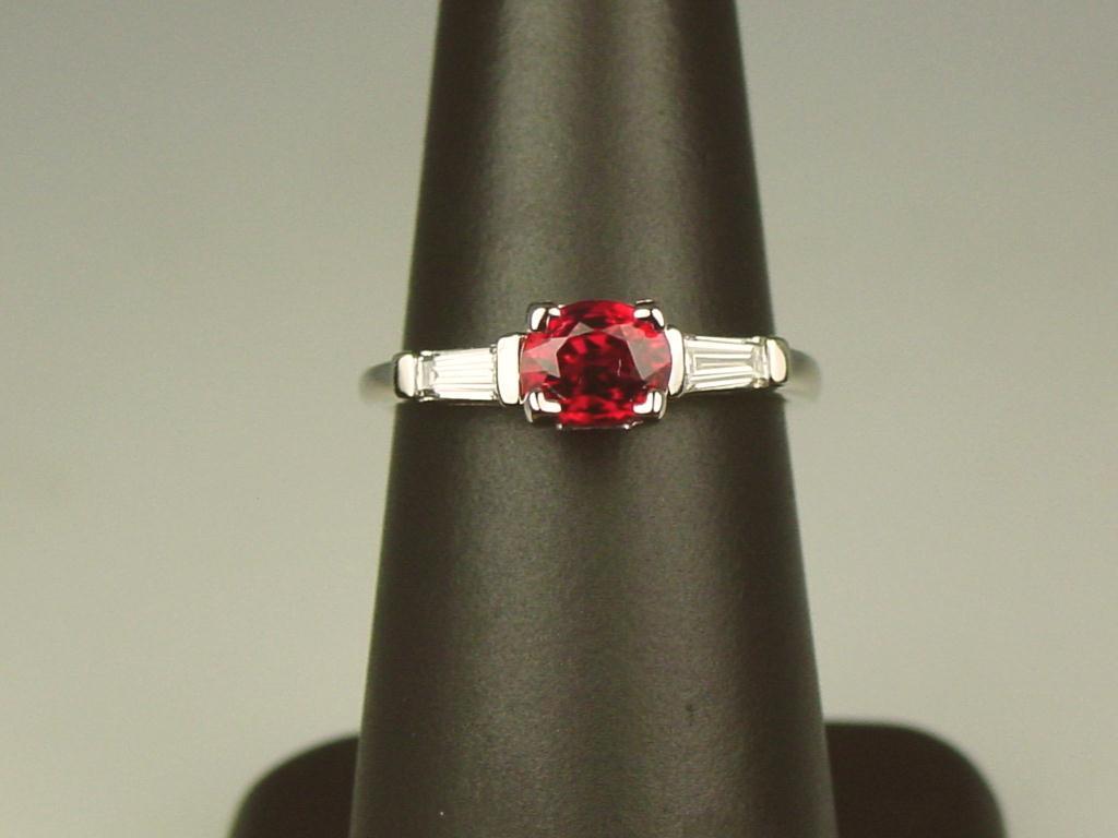 Hi-Quality 14K WG Ladies Vintage Estate Ring Set with a fine oval red ruby weighing 1.09 carat and 2 side matching tapered baguette cut diamonds weighing approx. 0.30 carats of F-G colors and VS clarity. Retail $3,950.00Set with a fine oval red ruby weighing 1.09 carat and 2 side matching tapered baguette cut diamonds weighing approx. 0.30 carats of F-G colors and VS clarity. Retail $3,950.00