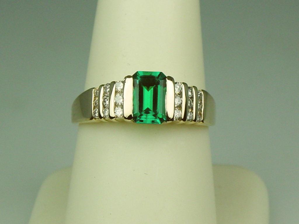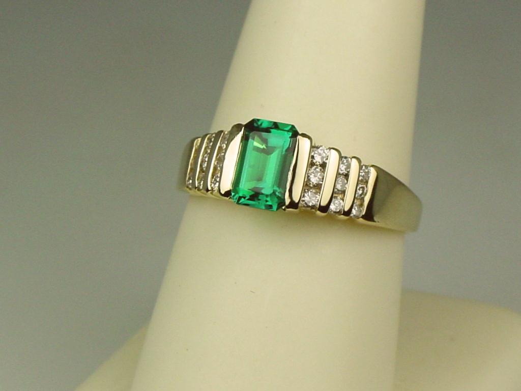 Hi-Quality 14K YG Ladies Custom Made Ring Set with a center Chatham style color emerald weighing approx. 1.00 carat and channel set with 18 fine round brilliant cut diamonds weighing approx. 0.40 carats of F-G colors and VS/SI clarity. Retail $1,550.00Set with a center Chatham style color emerald weighing approx. 1.00 carat and channel set with 18 fine round brilliant cut diamonds weighing approx. 0.40 carats of F-G colors and VS/SI clarity. Retail $1,550.00