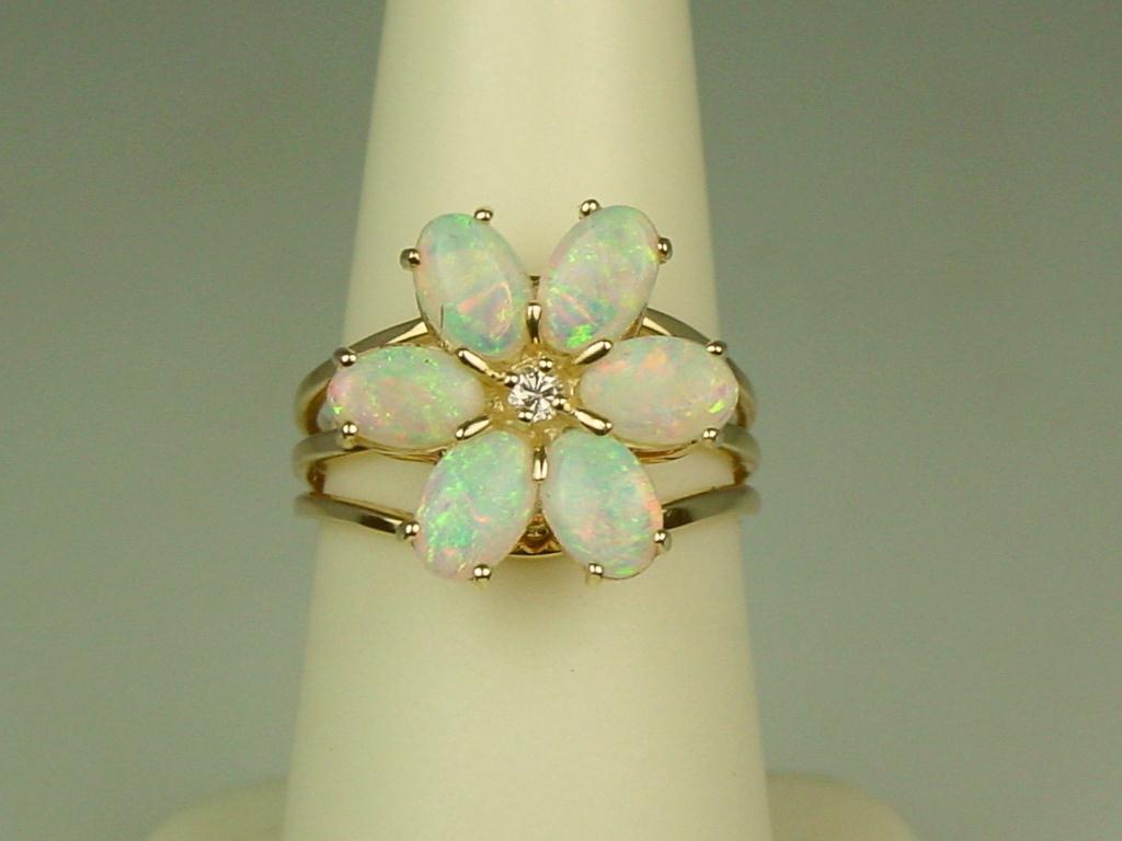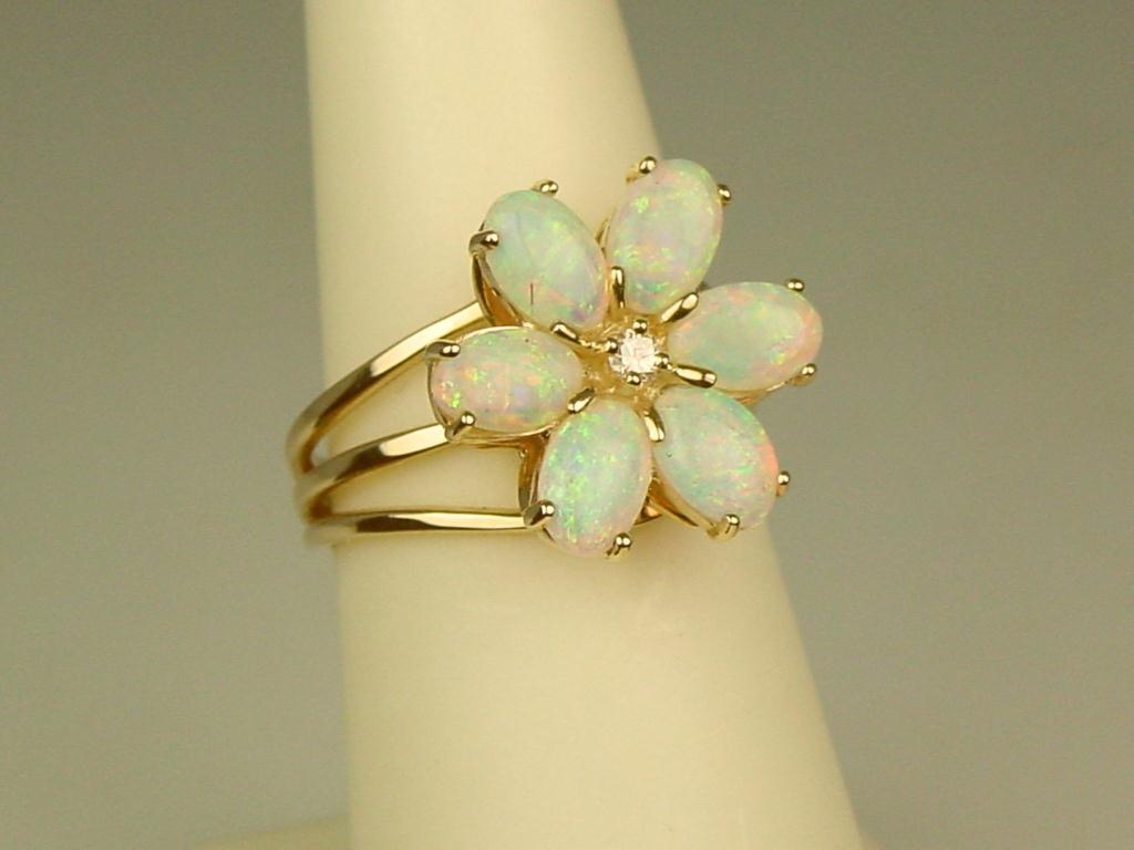 Hi-Quality 14K YG Ladies Flower Design Ring Set with 6 very fine quality Opal weighing approx. 2.00 carats and side diamond. Retail: $1,450.00Set with 6 very fine quality Opal weighing approx. 2.00 carats and side diamond. Retail: $1,450.00
