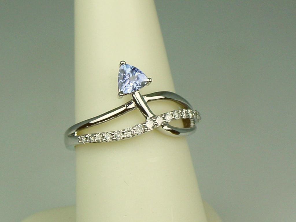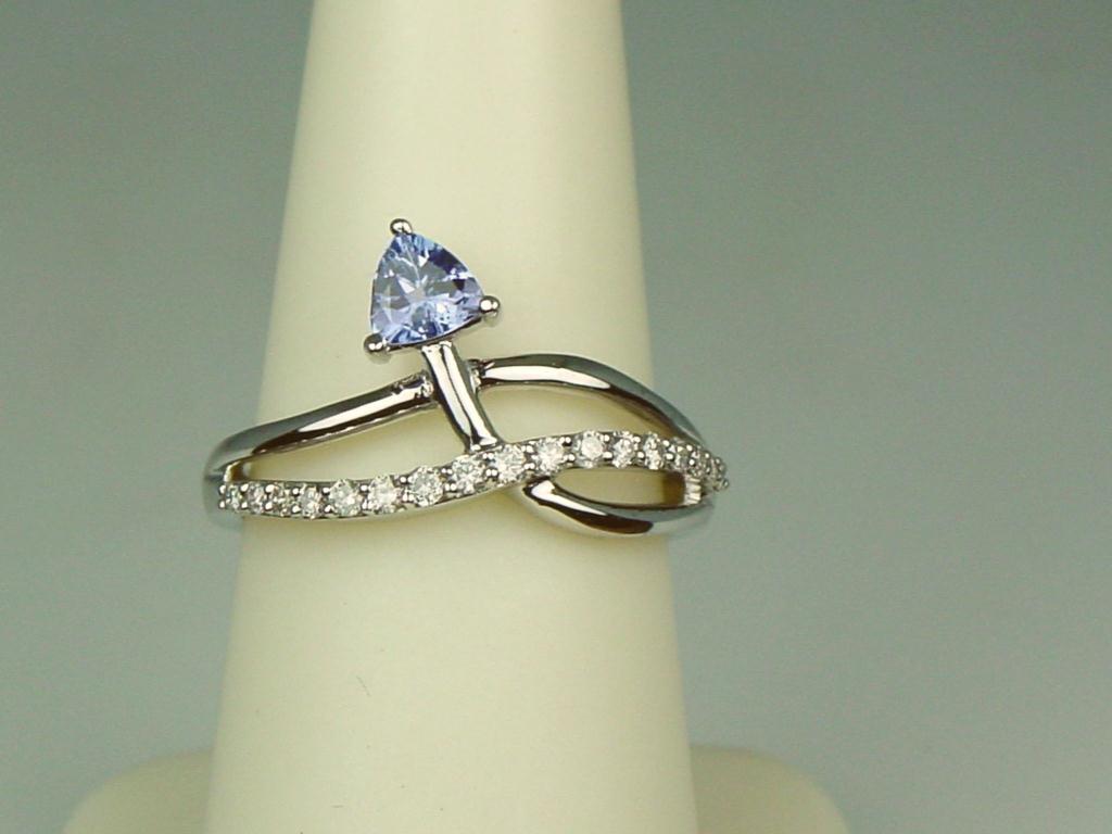 Hi-Quality Ladies 10K WG Ring Custom design, set with a trilliant cut Tanzanite and fine set with 18 round cut diamonds weighing approx. 0.30 carats of G-H colors and VS/SI clarity. Retail: $1,950.00Custom design, set with a trilliant cut Tanzanite and fine set with 18 round cut diamonds weighing approx. 0.30 carats of G-H colors and VS/SI clarity. Retail: $1,950.00