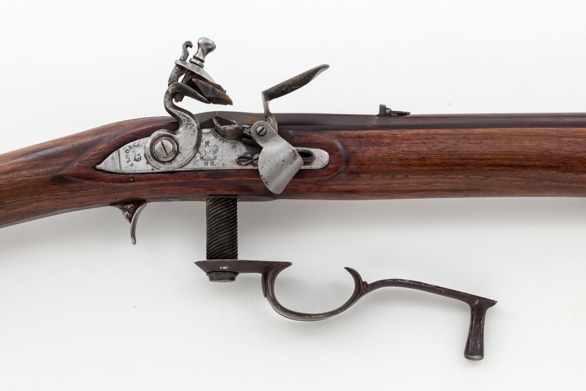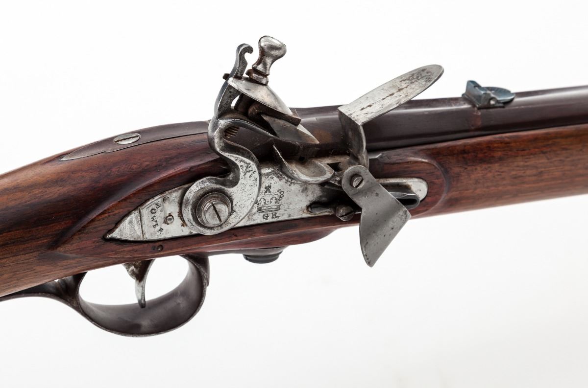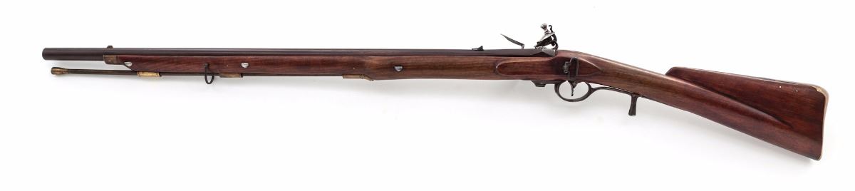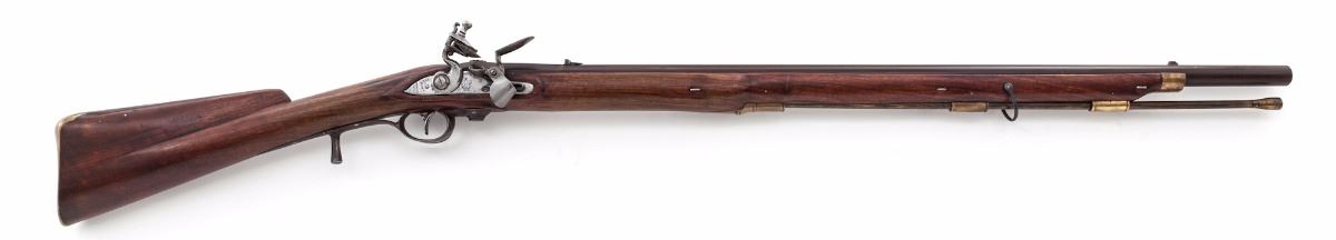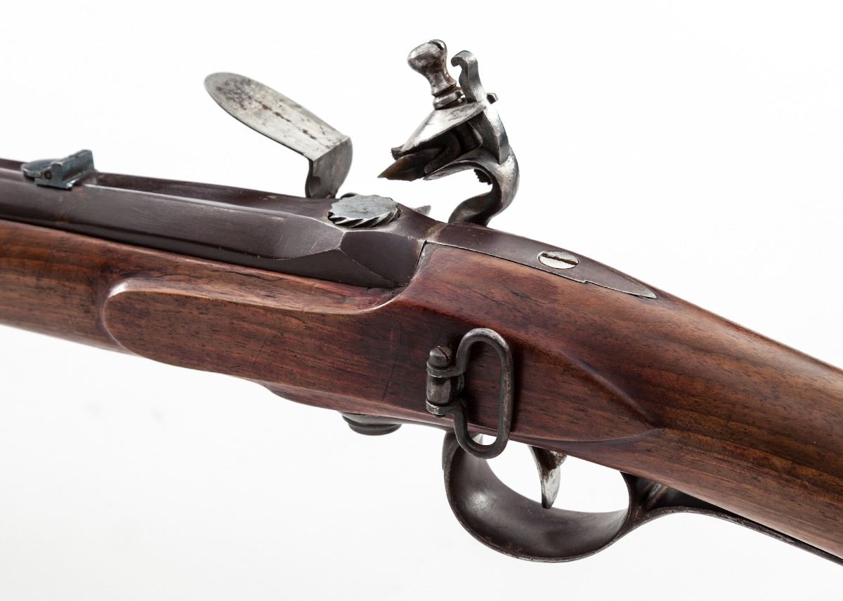 High Quality Recreation of Ferguson Breechloading Flintlock Rifle, by Ron Helyer, NVSN, .590 cal., 33'' brown barrel, ''Tower/(crown)/GR'' marked lockplate, correct style walnut stock, with brass buttplate, forend and ramrod ferrule. Ramrod is present. Condition is excellent, showing little use. Est.: $1,500-$2,000.
