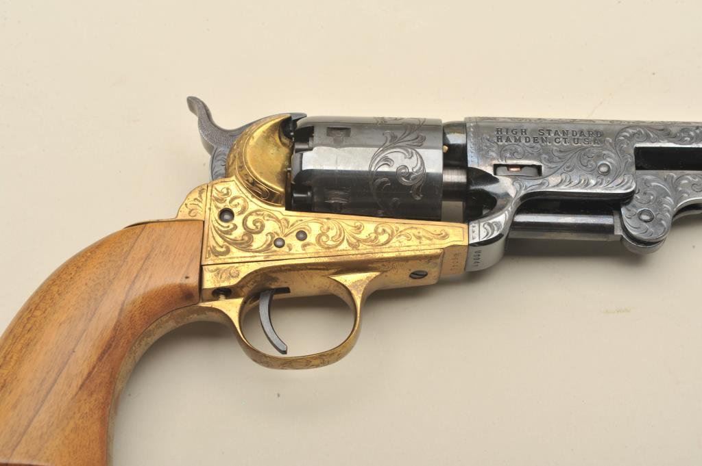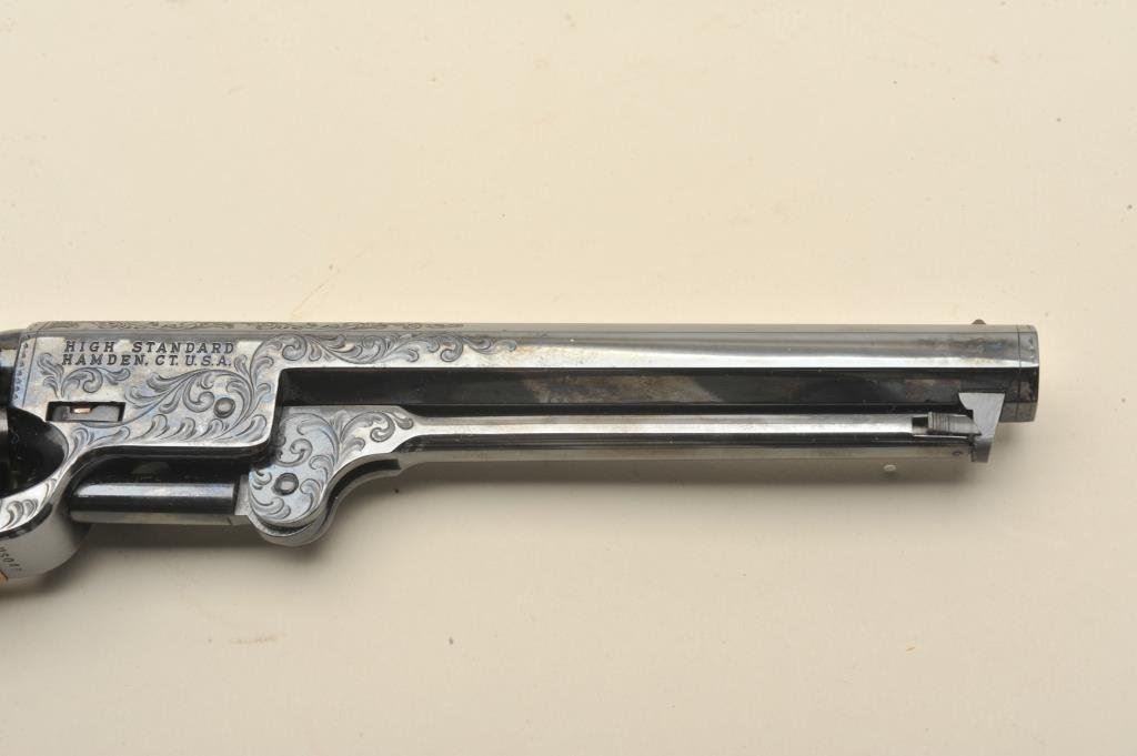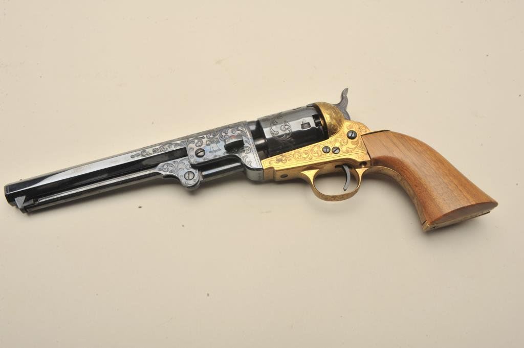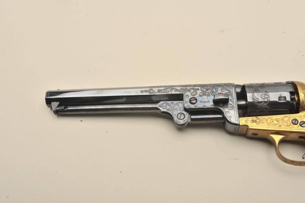 caliber percussion. Presentation hand engraved (1 of 100 produced), S/N USO48. Like new in original box with no sign of firing or use. The engraving is a classic “open scroll” reminiscent of Mid-19th century and expertly finished very attractive with liberty bell vignette on the left side of the barrel. (Percussion) Est.: $600-$1200