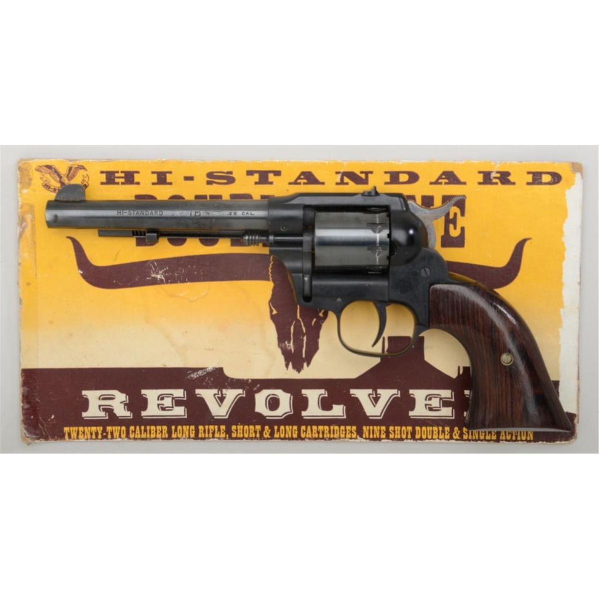 Hi-Standard Double Nine Model W-104 DA revolver, .22 cal., 5-1/2” barrel, black finish, wood grips, #1346856. This gun is in overall very good to fine condition showing the majority of its original finish with some holster wear and some scattered spots of erosion, crisp action and markings, very good bore, fine grips; accompanied by a factor box that is in need of careful conservation. Est.: $125-$250.