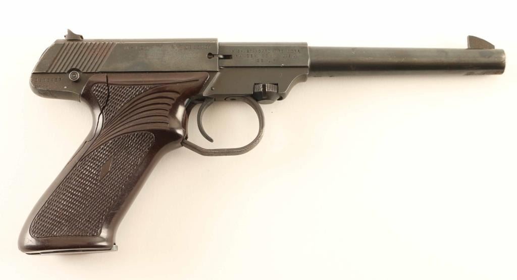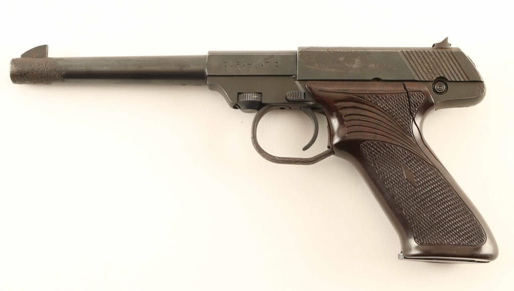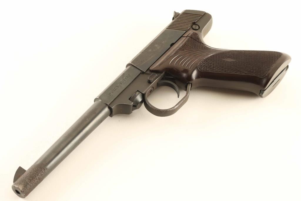 'M-101' Vintage striker fired semi-automatic pistol chambered in .22 Long Rifle, manufactured circa 1954-1970. Features a matte & polished blued finish, 6 1/2" barrel with thumb nut release, tall patridge front sight, dovetailed rear sight with square notch, serrated trigger, cocked indicator, push button safety/slide catch on the frame, push button magazine release on the left side of the frame, 10 round magazine, steel frame and one-piece checkered faux wood wrap-around synthetic grip. Pistol exhibits approximately 65% of its original finish with the balance showing pitting, rust and wear. Action is very smooth, the bore is bright with a spot of dark rust near the muzzle and the plastic grips are poor. Condition is NRA Fair. ***Modern Firearm***