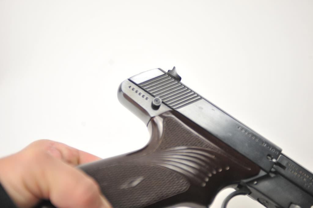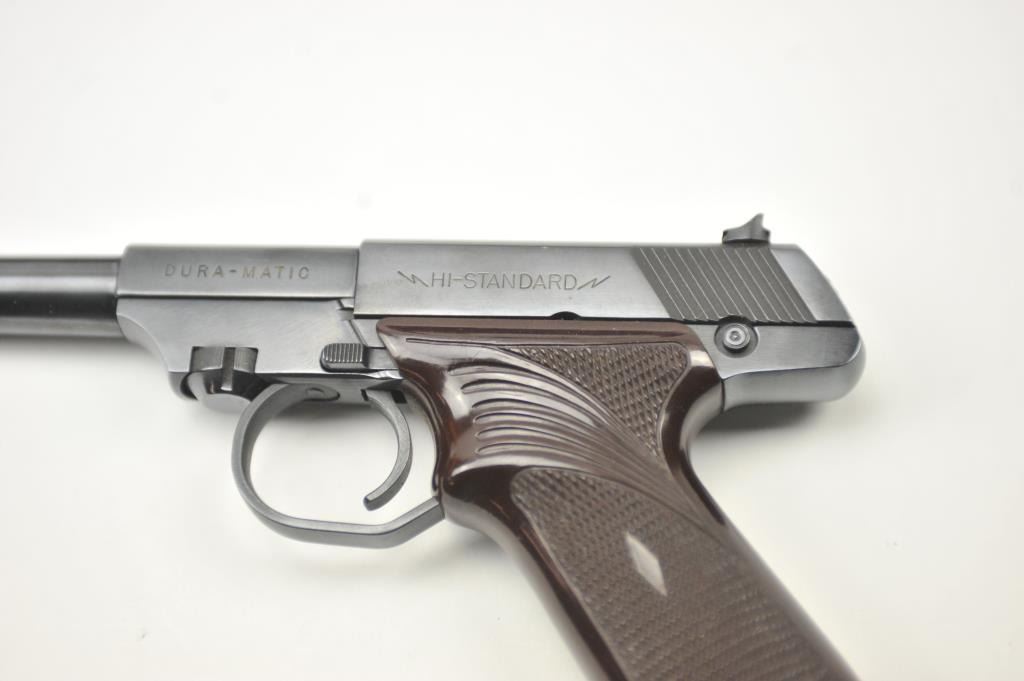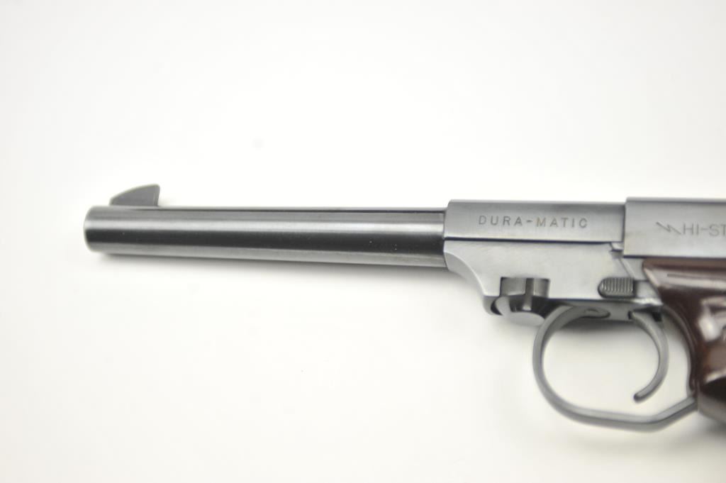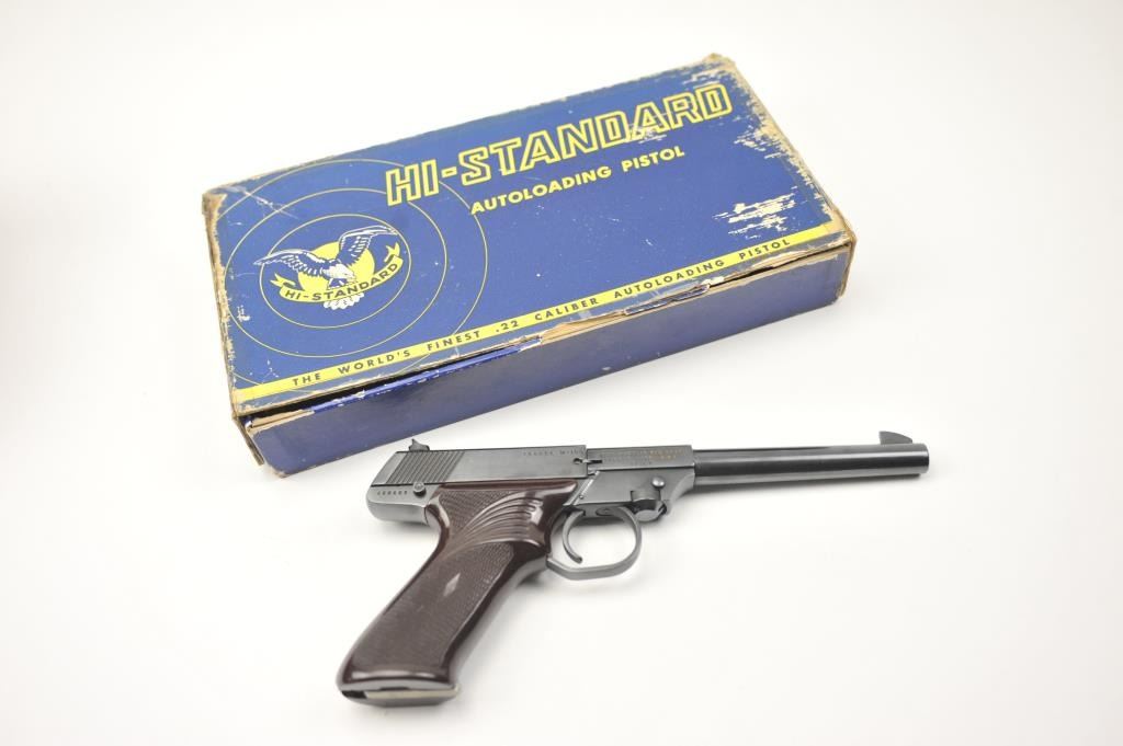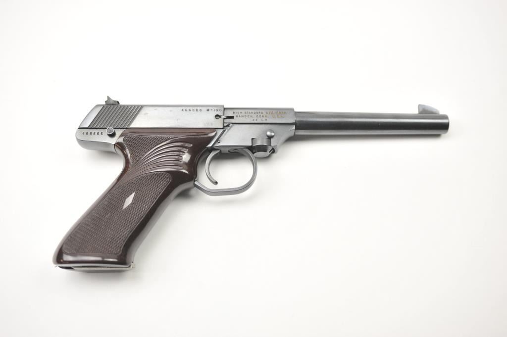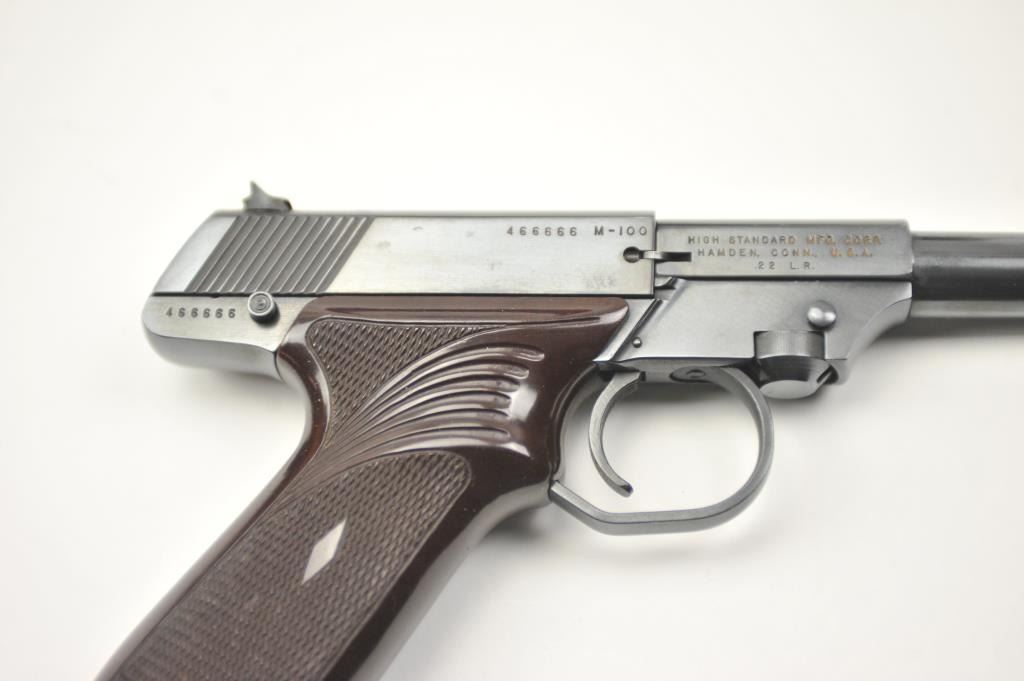 Hi-Standard Duramatic M-100 semi-automatic pistol, .22 Long Rifle caliber, Serial #466666. The pistol is in fine overall condition with a 6 ½” barrel. The checkered plastic grips are in very good condition.The lot includes the original factory cardboard box with matching end label. The bore is good, the action is crisp and the markings are sharp. The lot includes one correct magazine. Est.: $300-$600.(C+R/PPT).