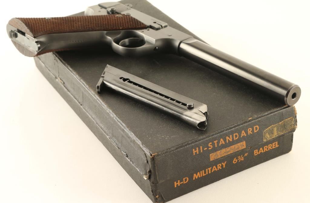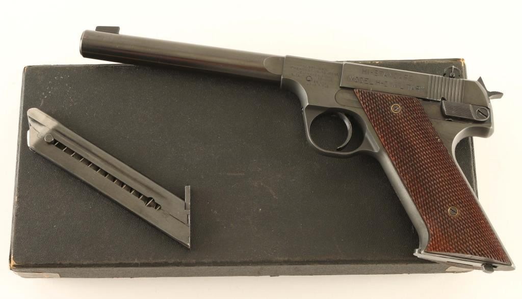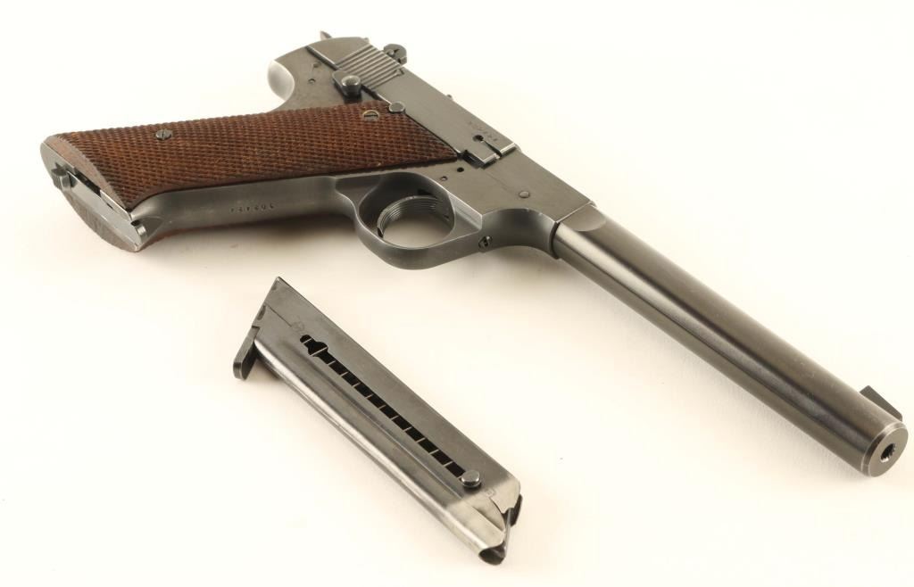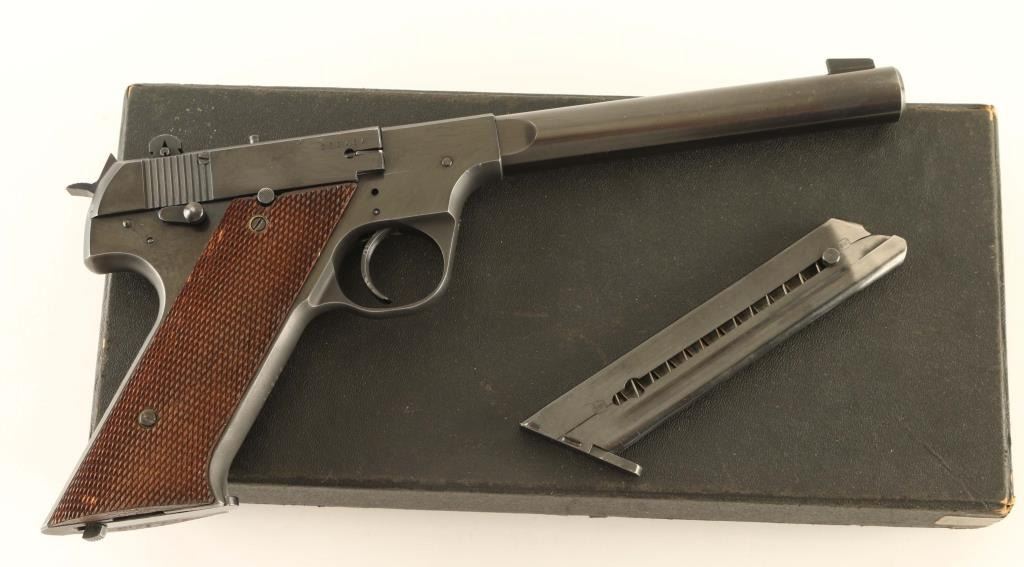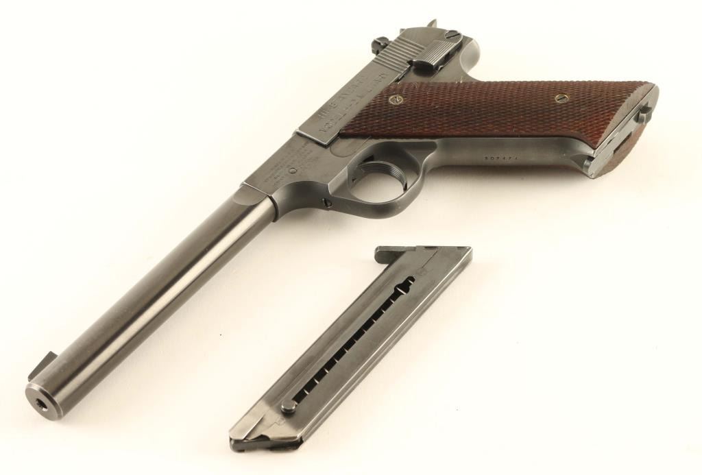 'Hammer Letter Series' Vintage single action semi-automatic target pistol chambered in .22 Long Rifle, manufactured circa 1949. Features a matte & polished blued finish, 6 3/4" medium weight barrel, serrated patridge front sight, dovetailed adjustable rear sight, serrated trigger, exposed hammer with knurled spur, thumb safety on the left side of the frame, slide catch & take-down lever on the right side of the frame, heel magazine release, two-tone 10 round magazine, steel frame and two-piece checkered walnut grips. Includes the original factory black cardboard box with documents and a spare two-tone magazine. Pistol retains approximately 95% of its original blued finish showing light scattered scratches, thinning on the grip straps and a minute amount of surface rust. Action is smooth, the bore is excellent and the wood grips are very good. Condition is near NRA Very Good. ***C&R Firearm***