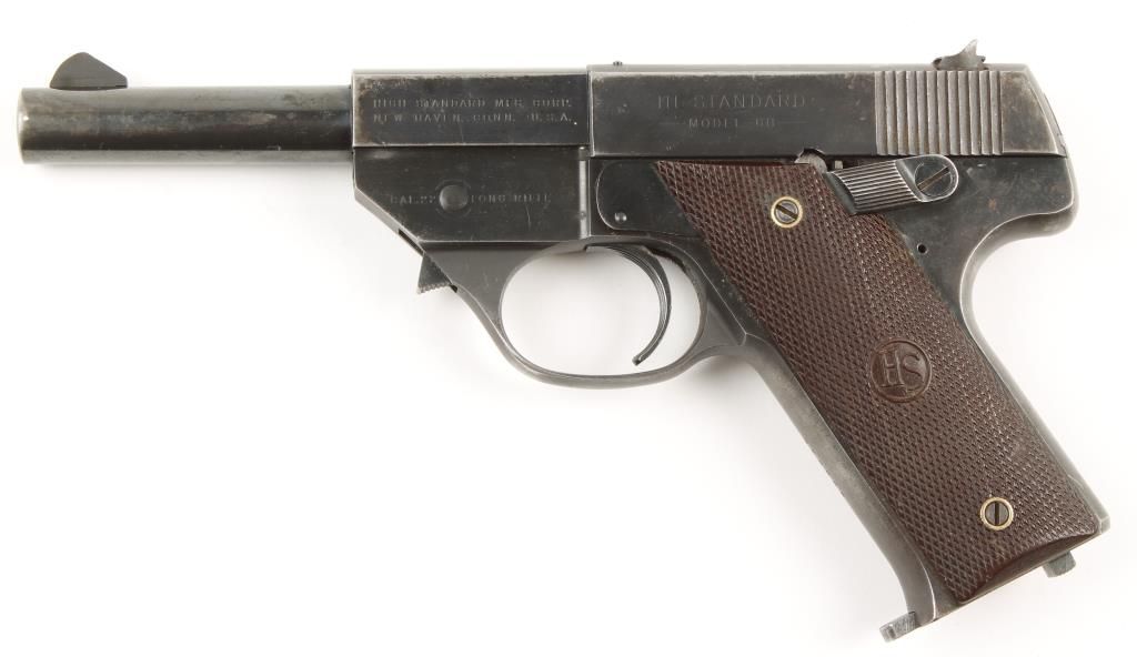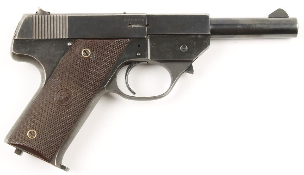 Single action semi auto rimfire pistol with 4-1/2" barrel. Blued finish, checkered brown plastic grips with "HS" monogram and fixed sights. Very good bore and action. Includes 1 magazine. Condition: Good showing light pinpricking and high point wear.