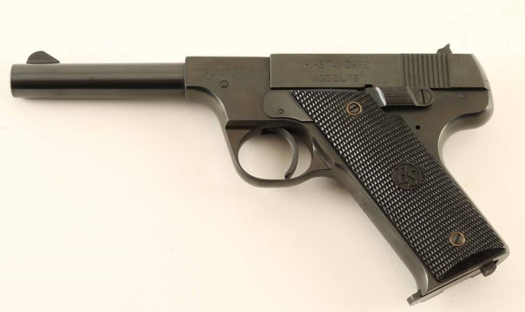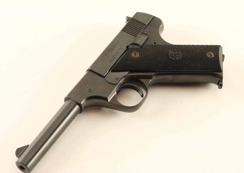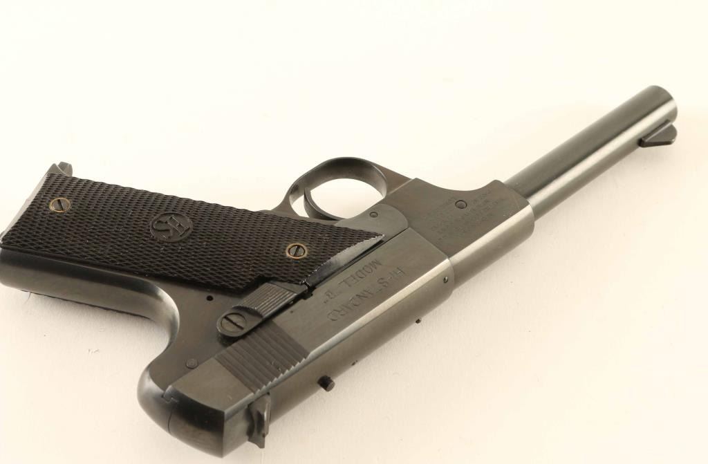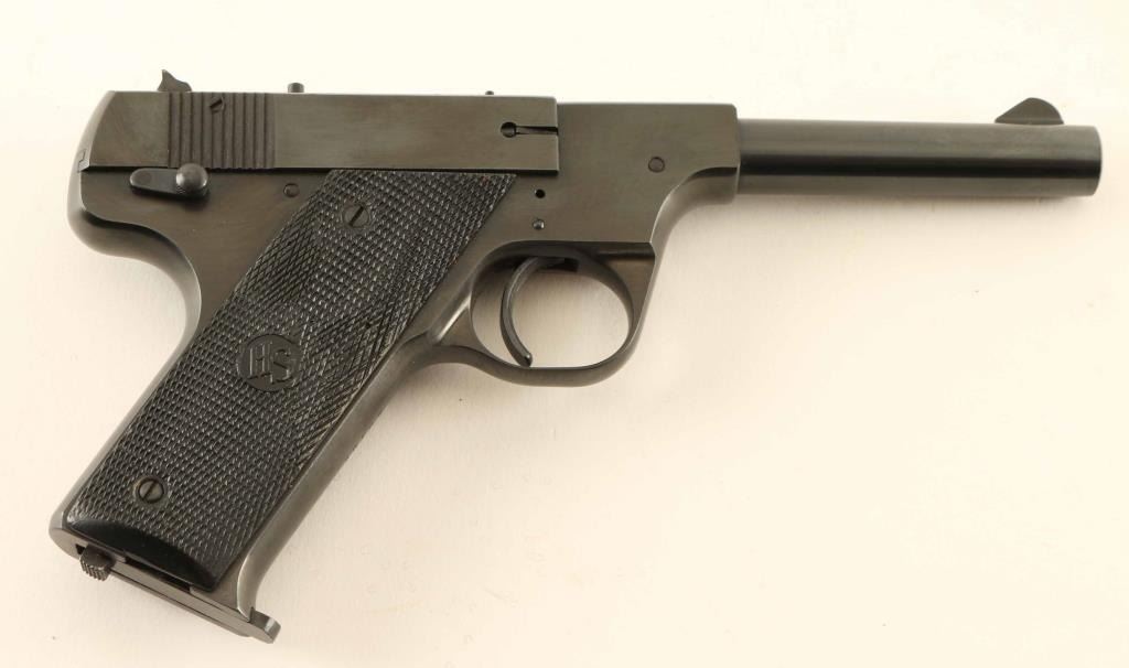 Vintage single action semi-automatic rimfire pistol chambered in .22 Long Rifle, manufactured in New Haven, Connecticut circa 1940. Features a blued finish, 4.5" barrel, blade front sight, dovetailed rear sight with square notch, serrated trigger, concealed hammer, manual safety on the left side of the frame, heel magazine release, 10 round magazine, steel frame and two-piece checkered black plastic grips with molded "HS" monograms. Serial numbers match on the frame and slide. Pistol exhibits approximately 90% of what appears to be a professional refinish showing some edge wear, light scattered handling marks and some old pitting. Action is sound, the bore is excellent and the factory grips are good with wear. Condition is NRA Good. ***C&R Firearm***