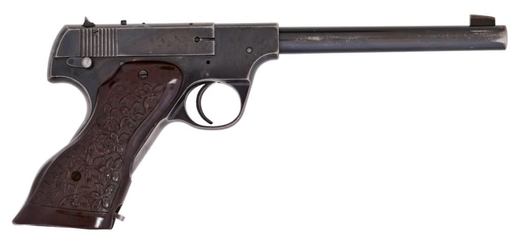 S/N 151149. Barrel measures 7", blue finish, Bakelite target grips.