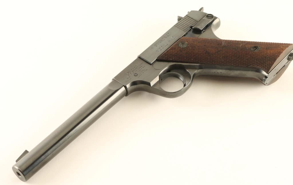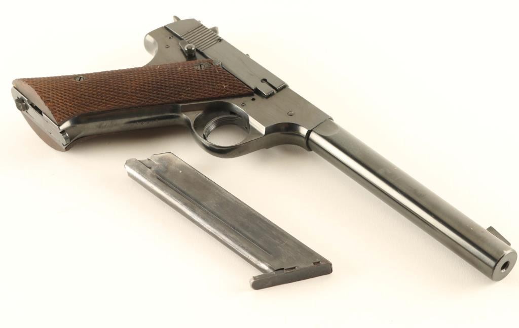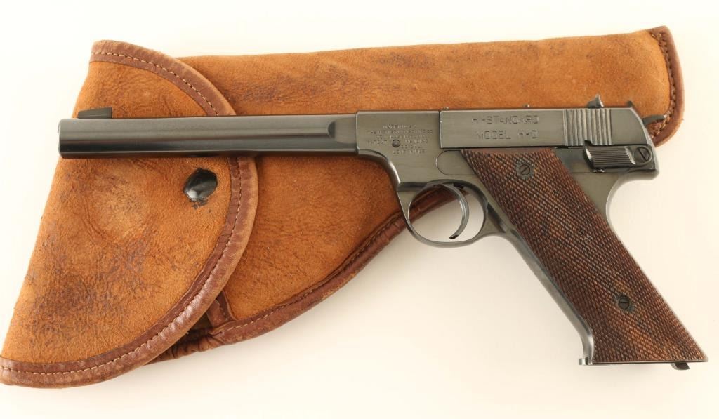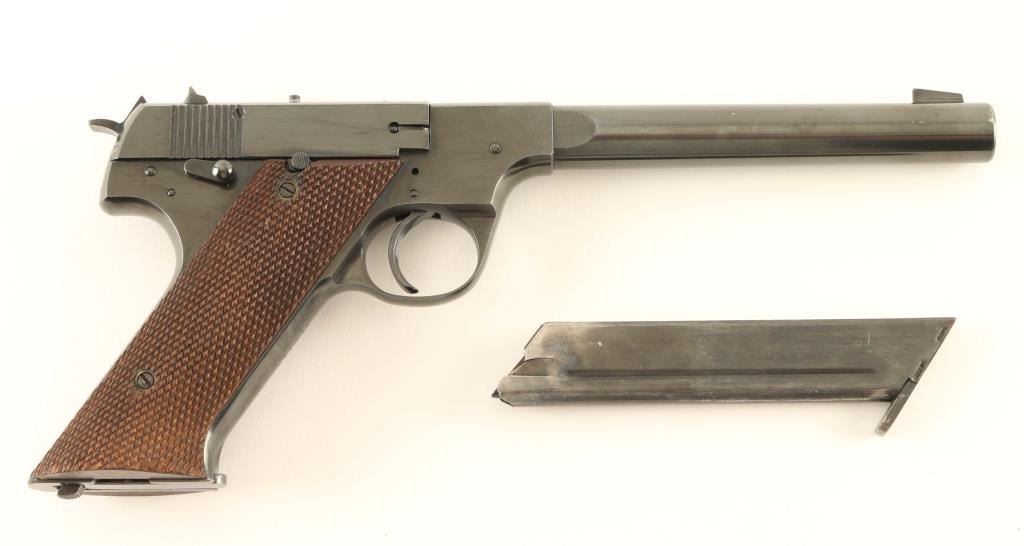 'Hammer Letter Series' Vintage single action semi-automatic target pistol chambered in .22 Long Rifle, manufactured circa 1945. Only an approximate 6,900 pistols were produced with the early “HI-STANDARD/MODEL H-D” roll stamp on the slide. Features a polished blued finish, 6 3/4" medium weight barrel, serrated patridge front sight, dovetailed rear sight with square notch, serrated trigger, exposed hammer with knurled spur, thumb safety on the left side of the frame, slide catch & take-down lever on the right side of the frame, heel magazine release, two-tone 10 round magazine, steel frame and two-piece checkered walnut grips. Includes a factory instruction sheet, wool lined holster and spare magazine. Pistol retains approximately 95% of its lustrous blued finish showing scattered scratches, light wear on the sides of the barrel and a small amount of light surface rust. Action is smooth, the bore is excellent and the wood grips are very good with minor losses. Condition is near NRA Very Good. ***C&R Firearm***