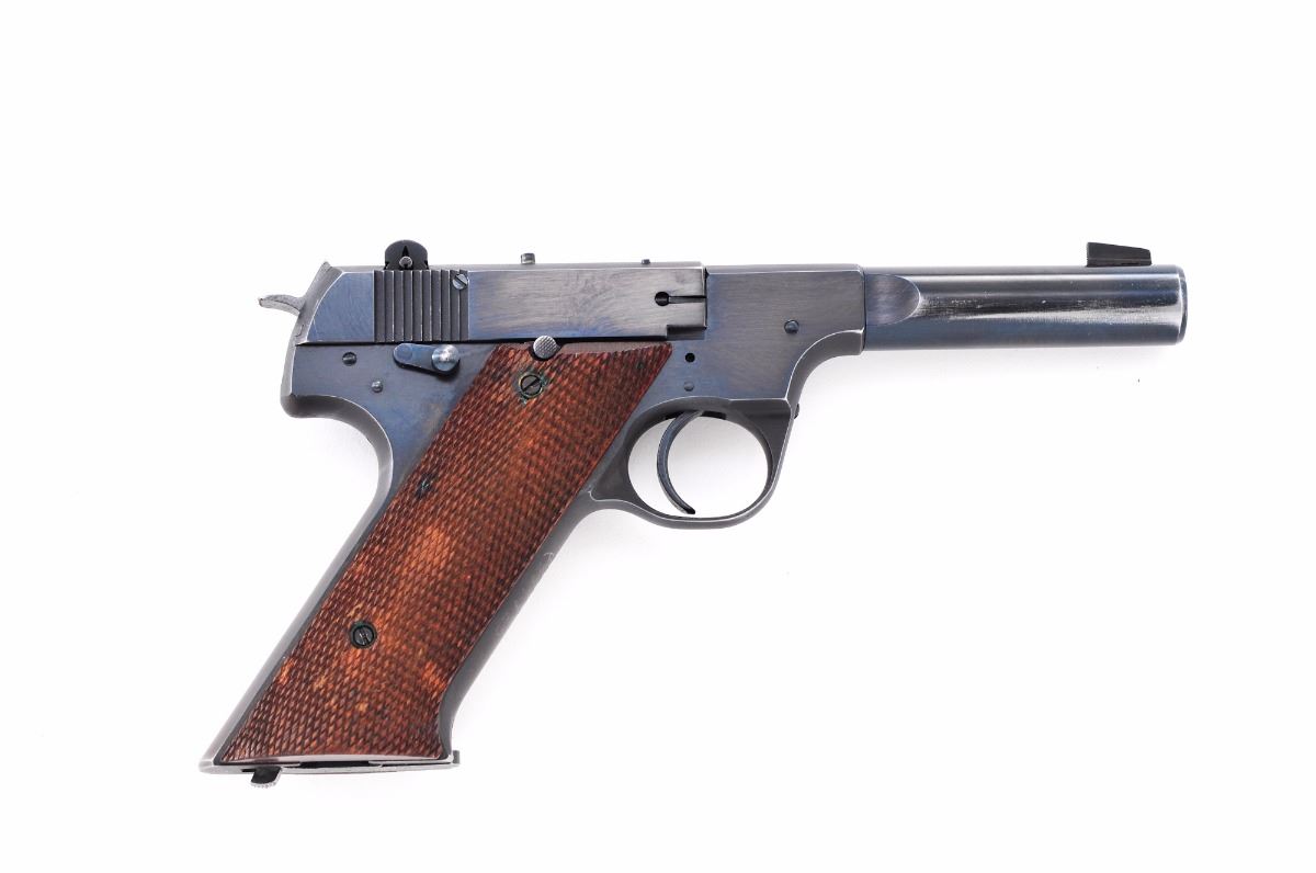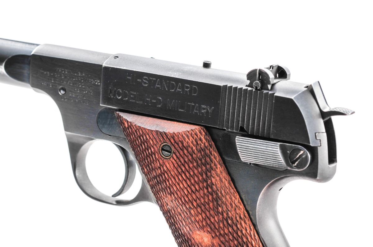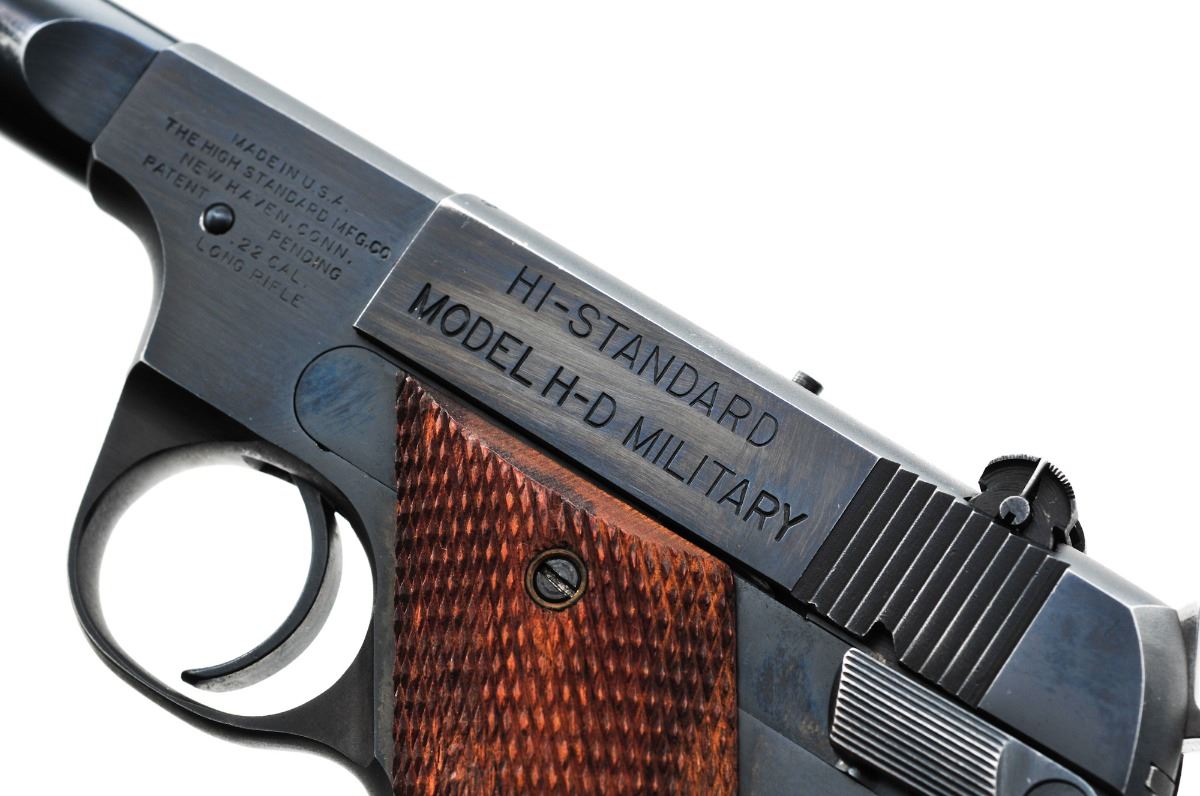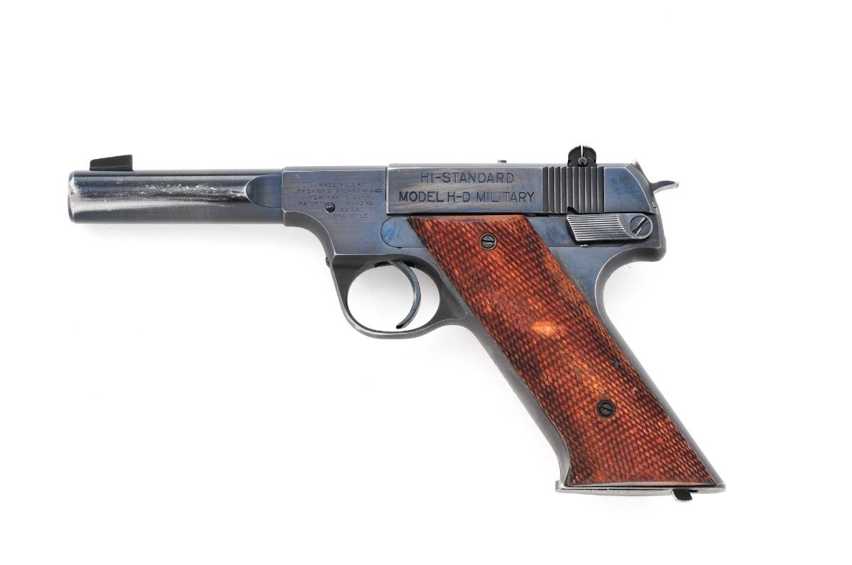 Hi-Standard Model H-D Military Semi-Automatic Pistol, #252853, .22 LR cal., 4-1/2'' barrel, blue finish, factory checkered walnut grips, standard sights, with one correct Hi-Standard magazine.  Condition is very good retaining approx. 90% original blue with thinning to front and back grip strap, as well as substantial losses to right and left sides of barrel.  Grips with some flattening and impressions, including one larger finger-size impression to the left grip panel.  Action and bore are excellent.  Est.:  $350-$500.  (C&R/PPT)