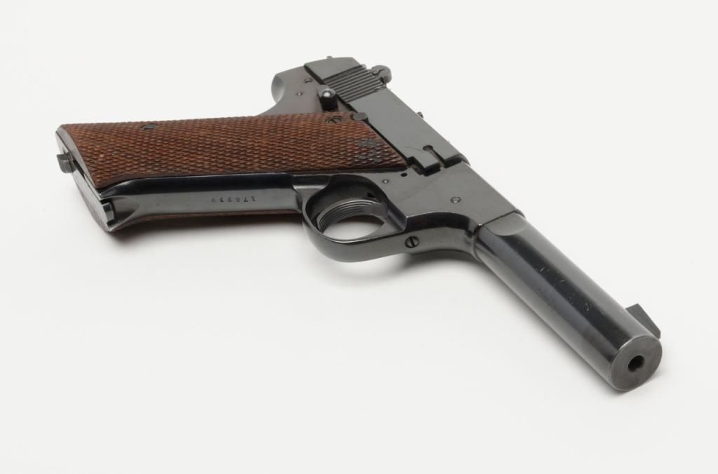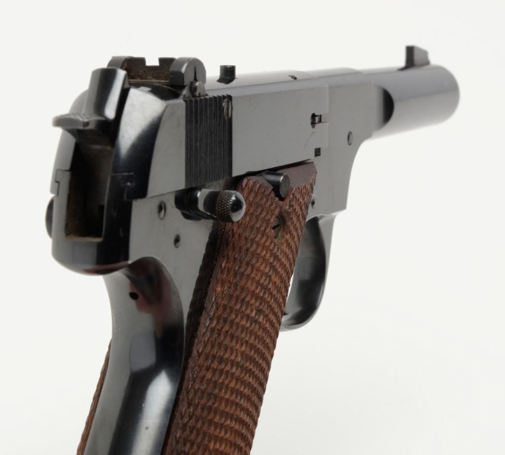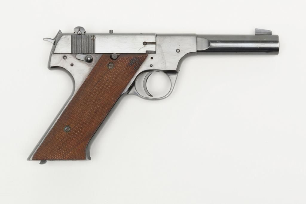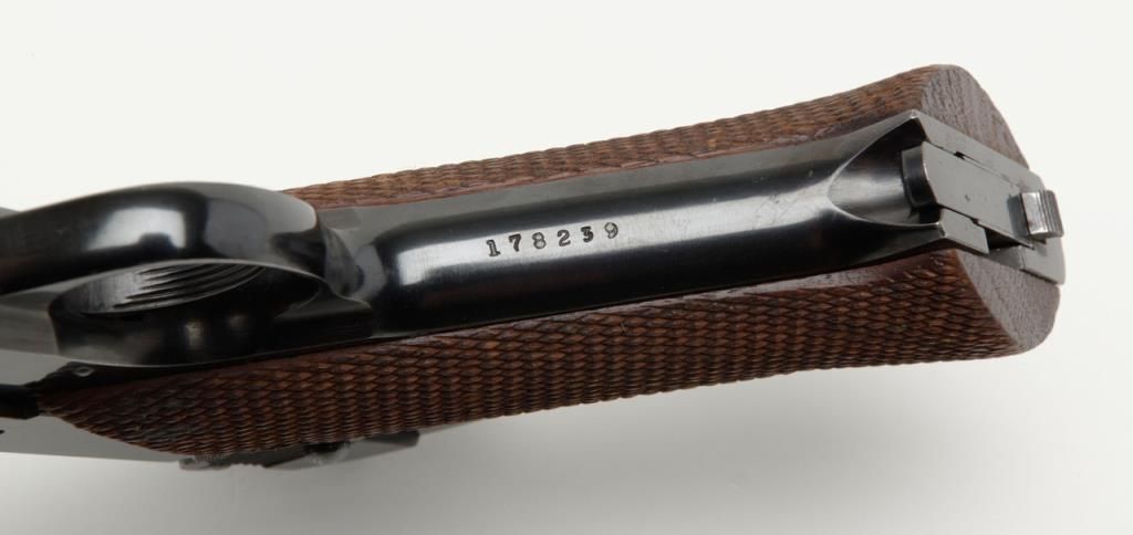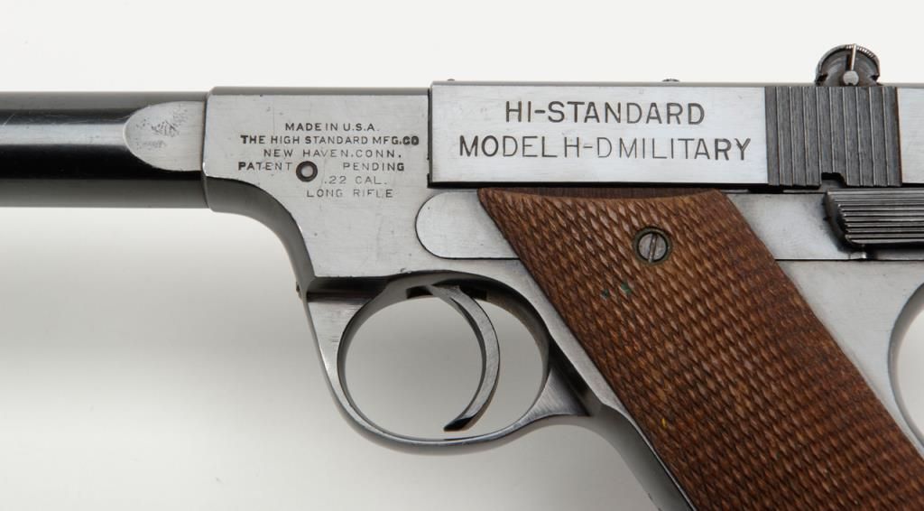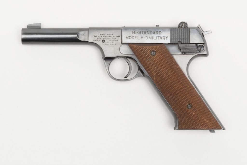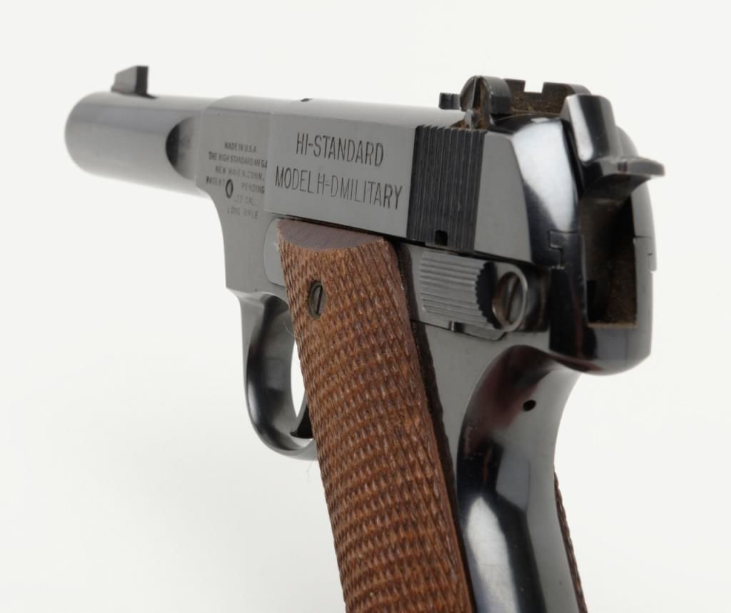 Hi-Standard Model H-D Military semi-auto pistol, .22LR cal., 4-1/2” barrel, blue finish, checkered wood grips, #178239 in overall fine condition showing the majority of its original blue finish with slight high point and muzzle wear; crispaction and markings, very good bore, fine grips; from an old California bay area estate. (C&R). Est.: $300-$600.