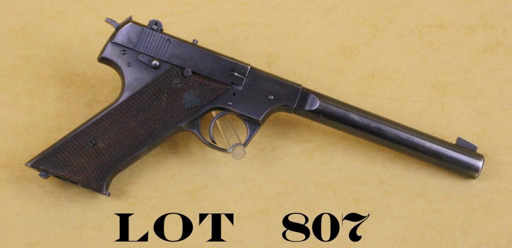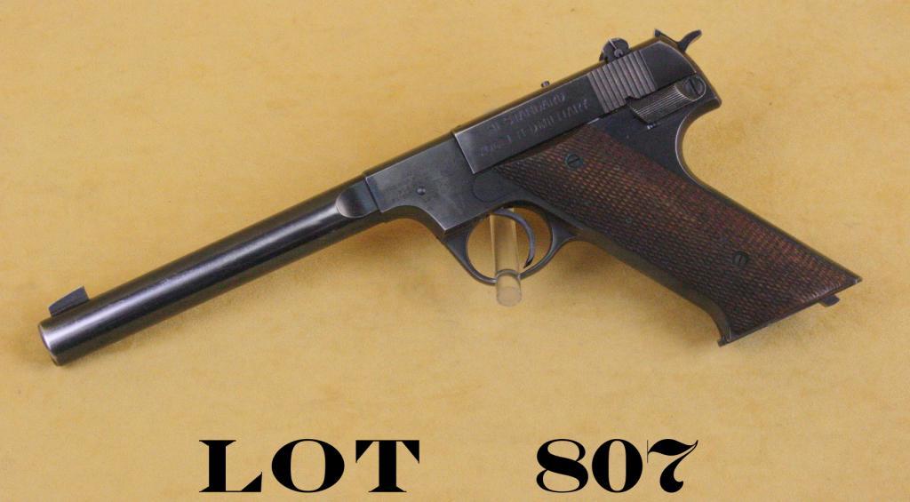 Hi-Standard Model H-D Military semi-auto target pistol, .22LR cal., 6-1/2” barrel, blue finish, checkered wood grips, correct two-tone magazine, #221439. This gun is in overall very good condition showing approx.80% original blue with majority of loss as holster wear along the sides of the barrel; very good bore, crisp action, very good grips with some wear and compressions to checkering. Est.: $300-$500.