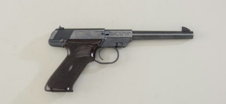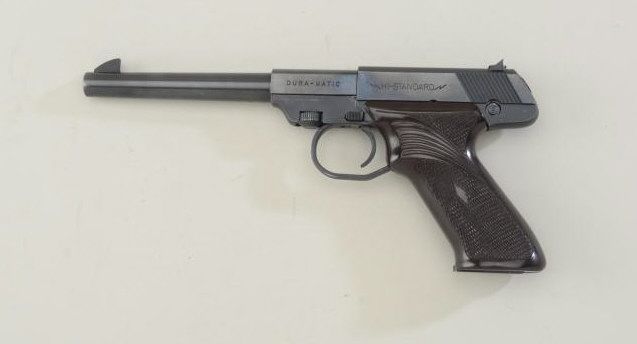 Hi-Standard Model M-101 Dura-Matic semi-auto pistol, .22LR cal., 6-1/2” barrel, blue finish, checkered maroon plastic grips, #1871962 in factory two-piece cardboard box with instructions; gun is in overall finecondition showing slight high point and muzzle wear, fine bore, action and markings, grips fine; box shows wear; accompanied by a Hunter brand leather holster. Est.: $250-$450.