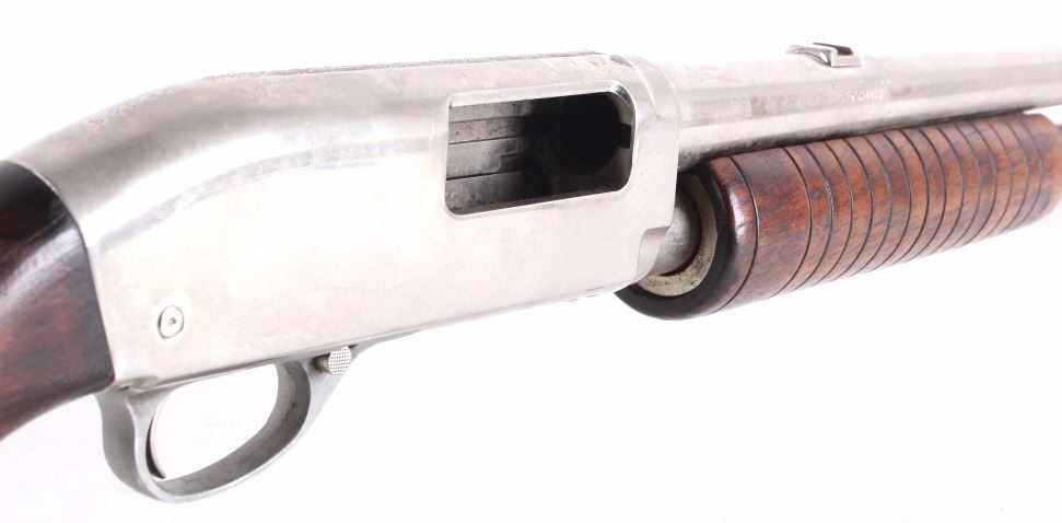 This lot features a High Standard Flite King Brush-20 Model K-101 12g riot shotgun circa 1962-65. This nickel plated shotgun features a wonderful contrast with its dark walnut stock. It is a cylinder bore with a 20" Barrel and a six shot capacity. The shotgun is marked "Flite King Brush-20 Model K-101 High Standard Hamden, Conn. USA Proof Tested 12 GA. 2 3/4 Chamber." The serial number is MS 149. Overall length is 40" This shotgun is in good condition for its age, showing little wear. The rear sight is not present