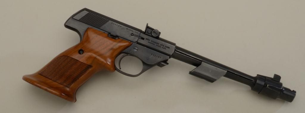 Hi-Standard Olympic Model 104 semi-auto target pistol, .22 short, 6-1/2” barrel including muzzle break, barrel weights, adjustable trigger, checkered wood medallion target grips, #1621988. This gun is inoverall excellent condition showing approx. 98% original finish, fine bore, action, markings and sharp wood grips; adjustable rear sight; a fantastic target pistol and very collectible. Est.: $600-$900.