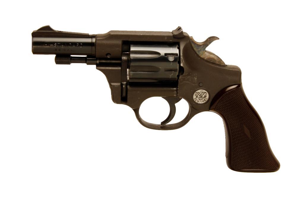 Hi Standard Sentinel Cal .22 SN:1035178 Double action, 9 shot .22 revolver. Blued barrel and cylinder, flat black frame, black checkered plastic grips, 3" barrel, good bore and action. Condition: Very good with a little surface scratching to the frame. Just a little larger than a kit gun!