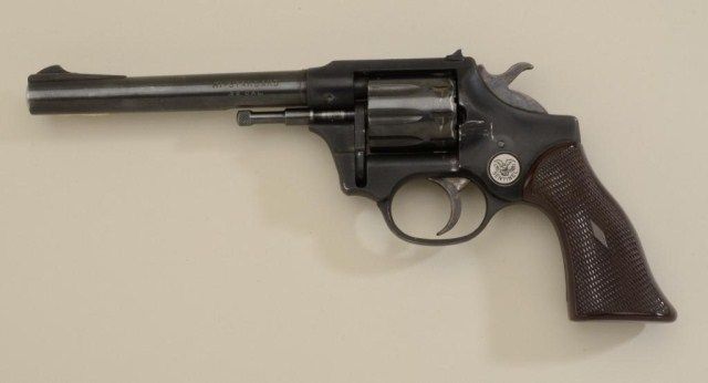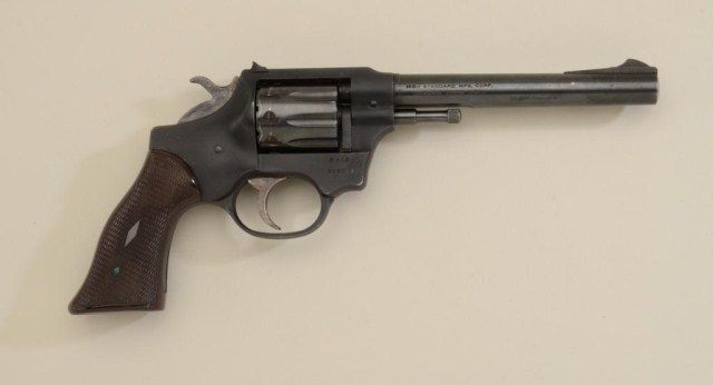 Hi Standard Sentinel Model R 101 DA revolver, .22 cal., 6” barrel, black finish, checkered maroon plastic grips, #628774. This gun is in overall very good condition showing the majority of its original finish, good bore,action, markings and grips. Est.: $100-$150.