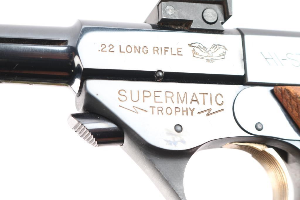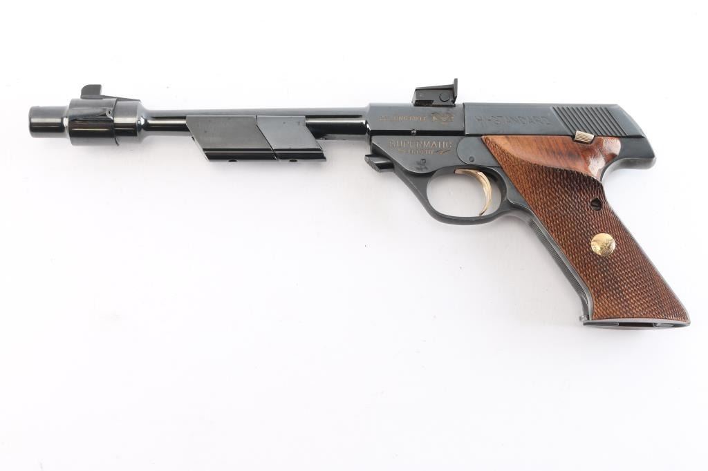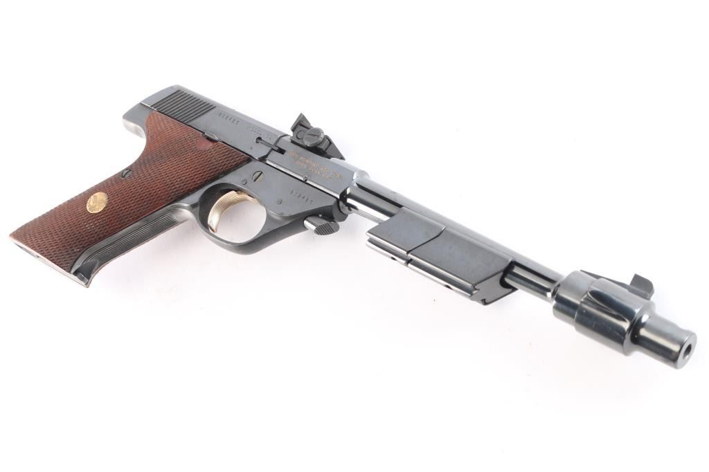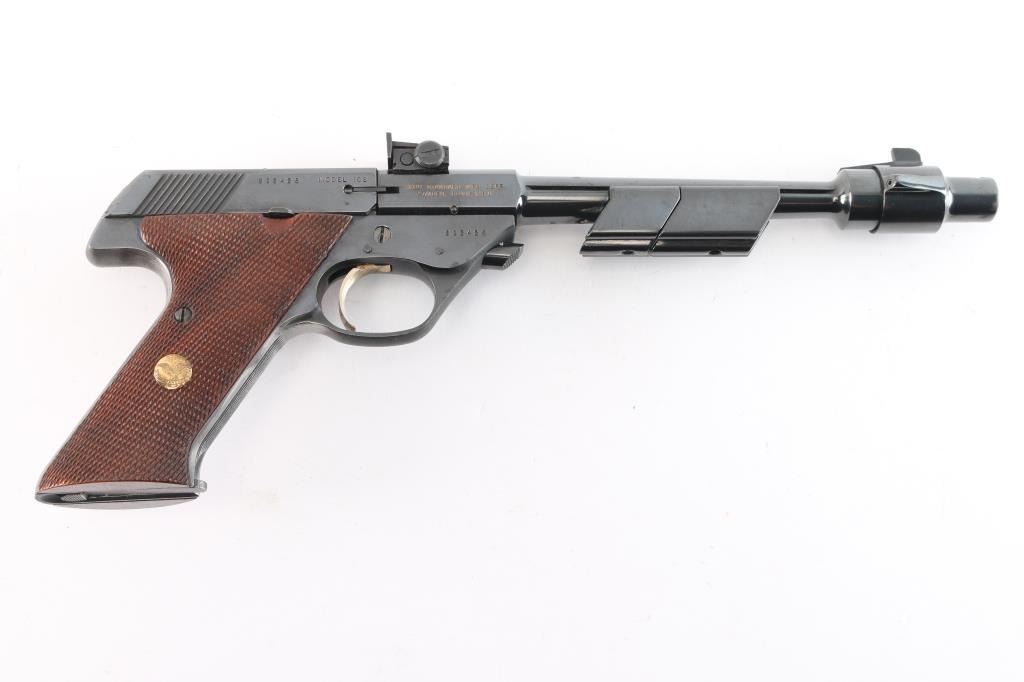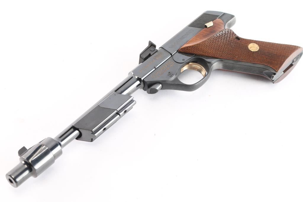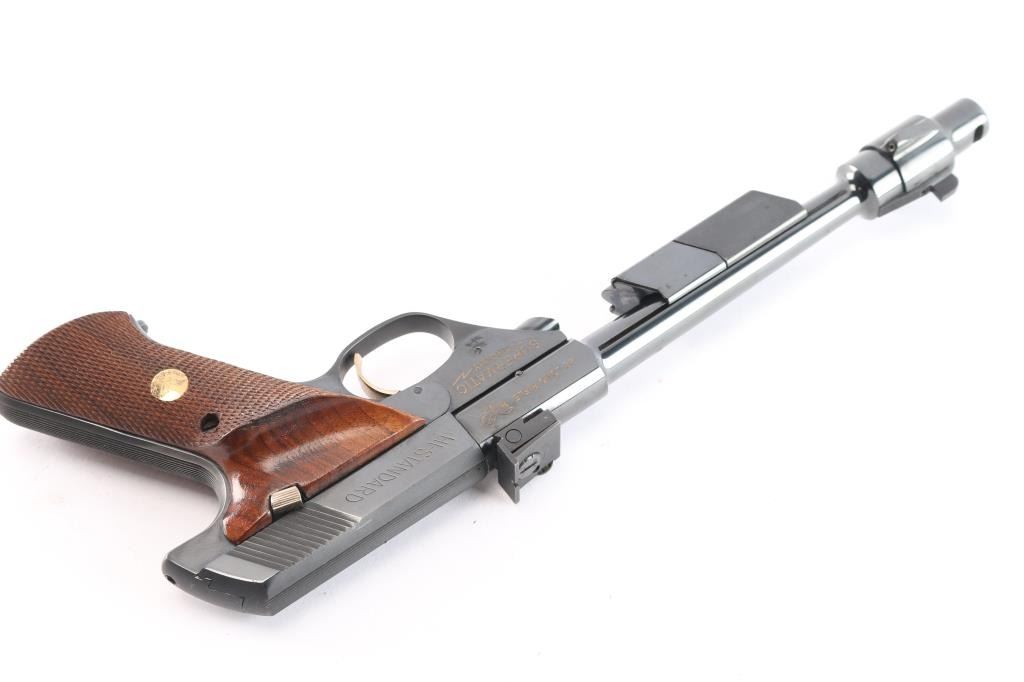 Semi-automatic rimfire pistol chambered in .22 LR. Circa 1957-58. Features a polished blue finish, 9" barrel with raised Patridge front sight, compensator and barrel weights. Adjustable rear sight, right hand checkered walnut target grips with thumbrest and gold medallions, serrated front and back straps on frame, gold-colored manual safety, gold-colored serrated curved wide trigger and serrated heel magazine release button. Bore is pristine. Retains approximately 90% of it's original bright blued finish showing minor edge wear, finish loss on the grip straps and a small amount of scattered light surface rust. Wood grips are very good. Includes one 10rd metal magazine.