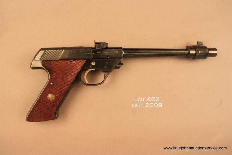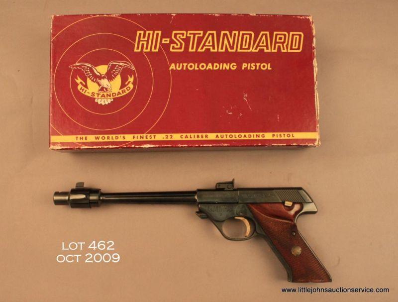 Hi-Standard Supermatic Trophy Model deluxe target pistol, 8" barrel with muzzle break, blue finish, checkered medallion wood grips, #1028179. This gun is in excellent condition showing approx. 98% original finish, fine bore, action, markings andgrips; contained in Hi-Standard lined wood presentation case with extra magazine, and barrel weights. For its time, this was one of the most accurate target pistols available and this one has most of the bells and whistles available. Est.: $500-$1,000.